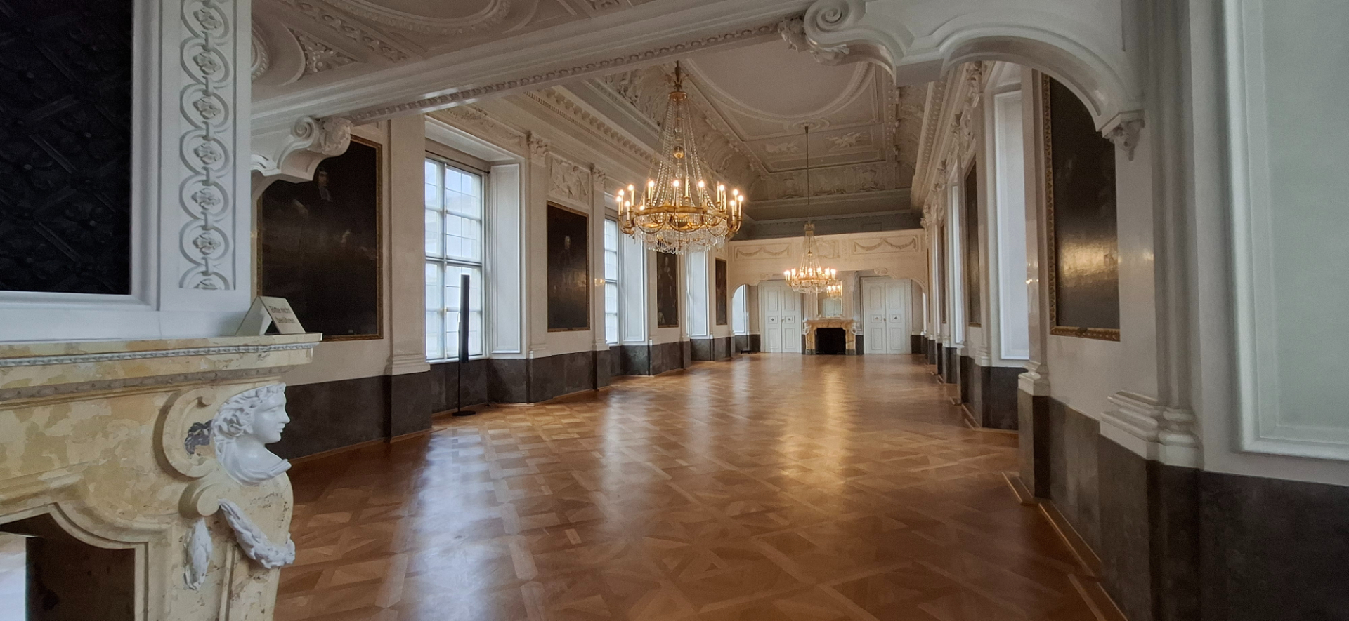 На противоположных сторонах большие зеркала в золотом обрамлении над каминами. Мое личное впечатление – эта резиденция «даст фору» мюнхенской. При обходе помещений непроизвольно сравнивала их. Не количеством комнат превосходит она дворец в Мюнхене, а разнообразием оформления, декорирования.