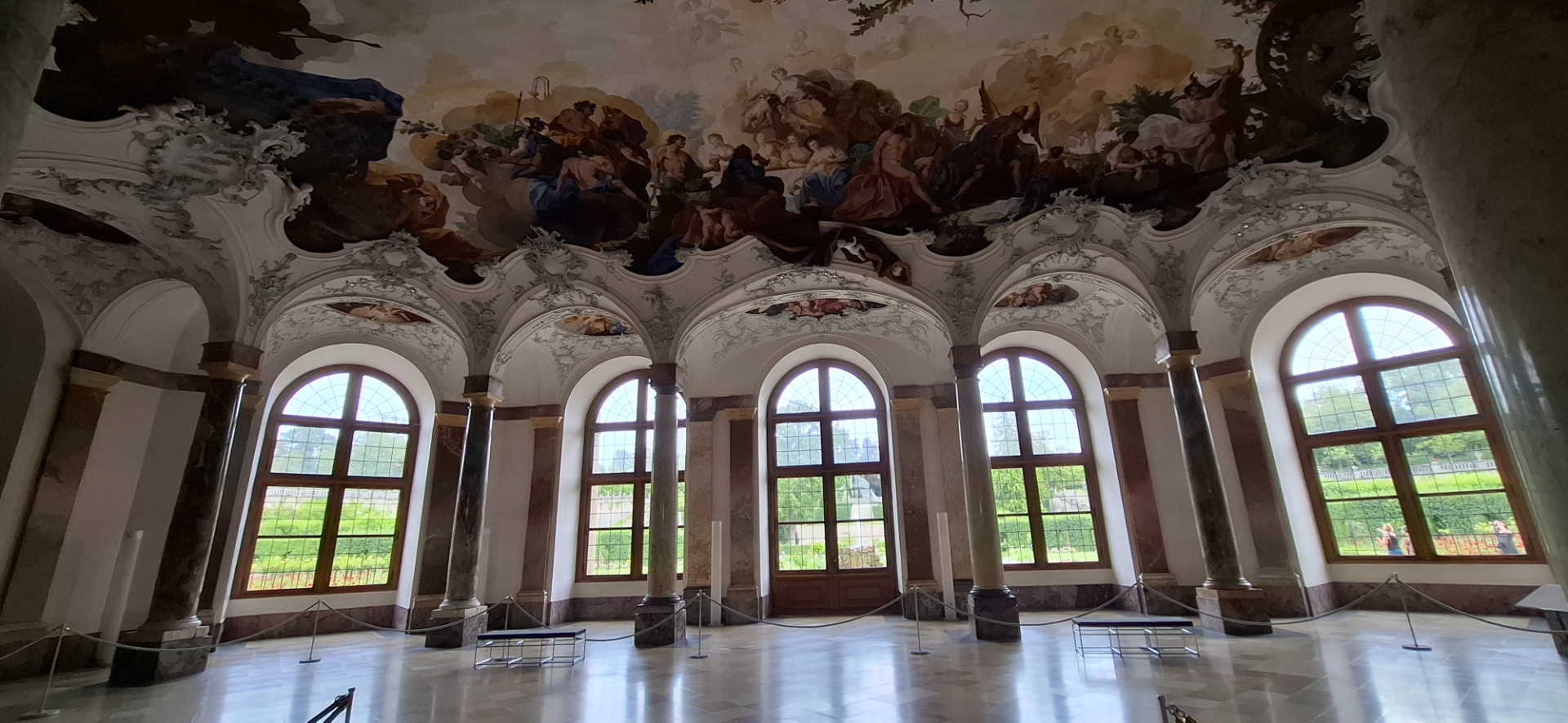 Первый этаж отдан в основном службам музея. Но тут начинается великолепная лестница и находится зал, выходящий окнами в сад, «Садовый зал». По контрасту с несколько распластанным овальным зальным объемом Нойман выстроил внутри него сферическую аркаду из стройных колонн, над которой раскинулся легкий шатер свода. Он впечатляет своими росписями, которые выполнил Иоганнес Цик. Арочная галерея с колоннами окружают зал по периметру и создают воздушность пространству.
