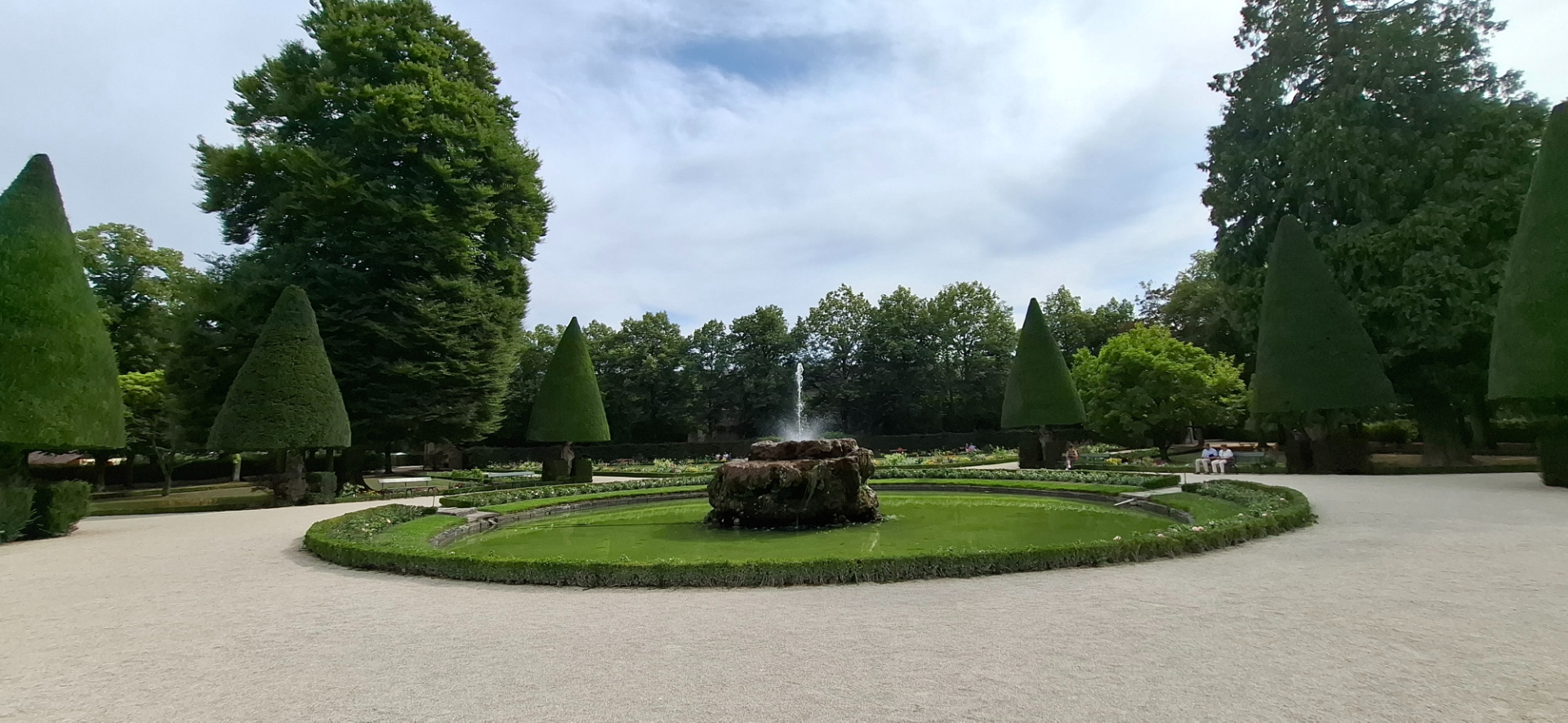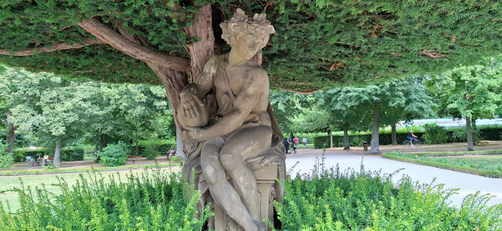 В Восточной части парка вокруг фонтана по кругу стоят стриженные пирамидками тисы, как стрелки циферблата. Заодно они своеобразные зонтики для статуй, скрывающихся у оснований стволов.