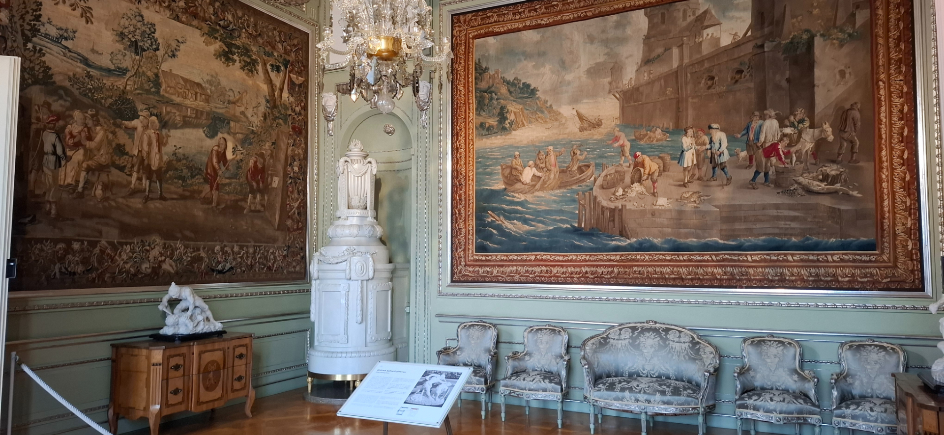 Малый кабинет выделяется от других помещений настенной отделкой в виде стеклянных панелей, украшенных рисунками в азиатском стиле. Гобелены на стенах других помещений.