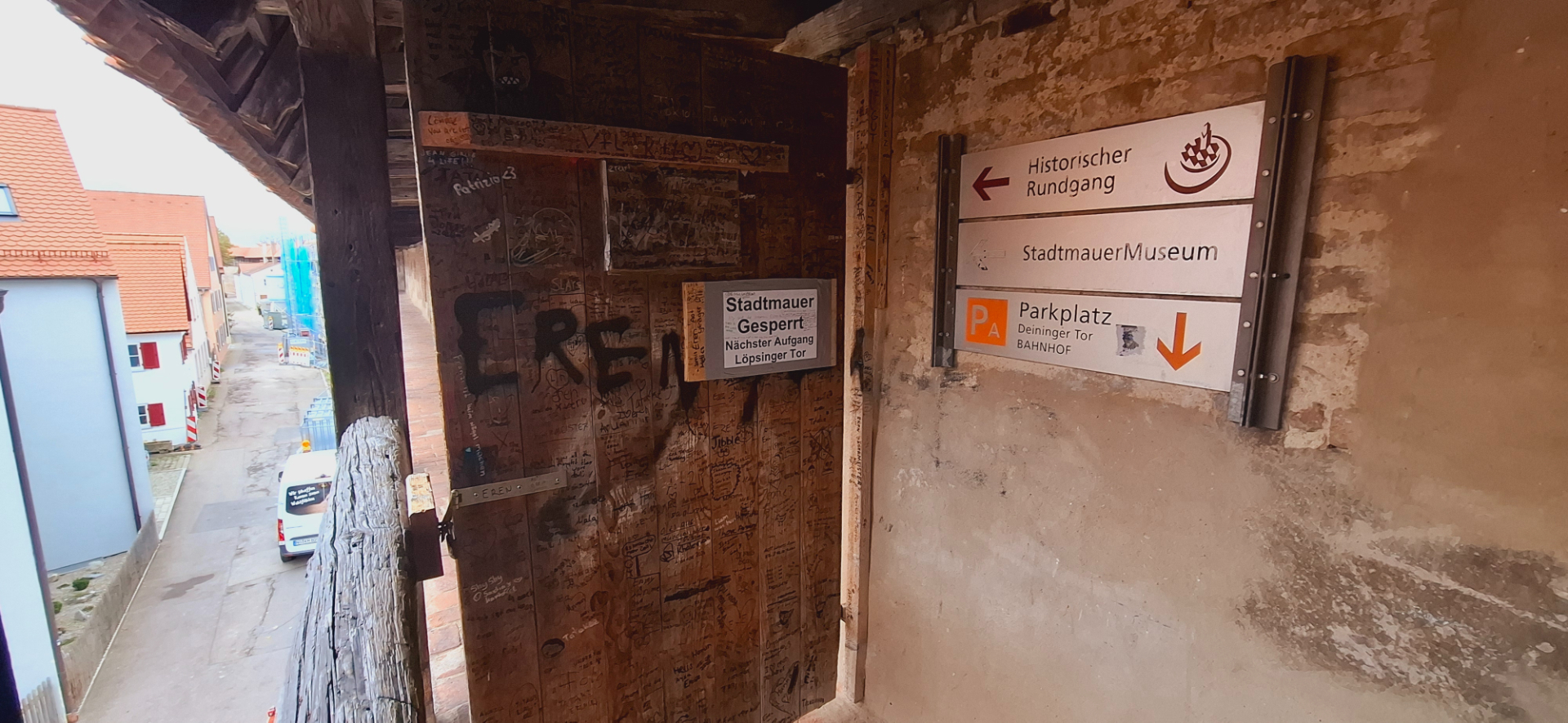 Пройти в мой приезд всю окружность стен было невозможно из-за продолжающихся ремонтов. Мне и нужно было «сойти на остановке» башни Дайнингер-Тор, дальше к вокзалу.