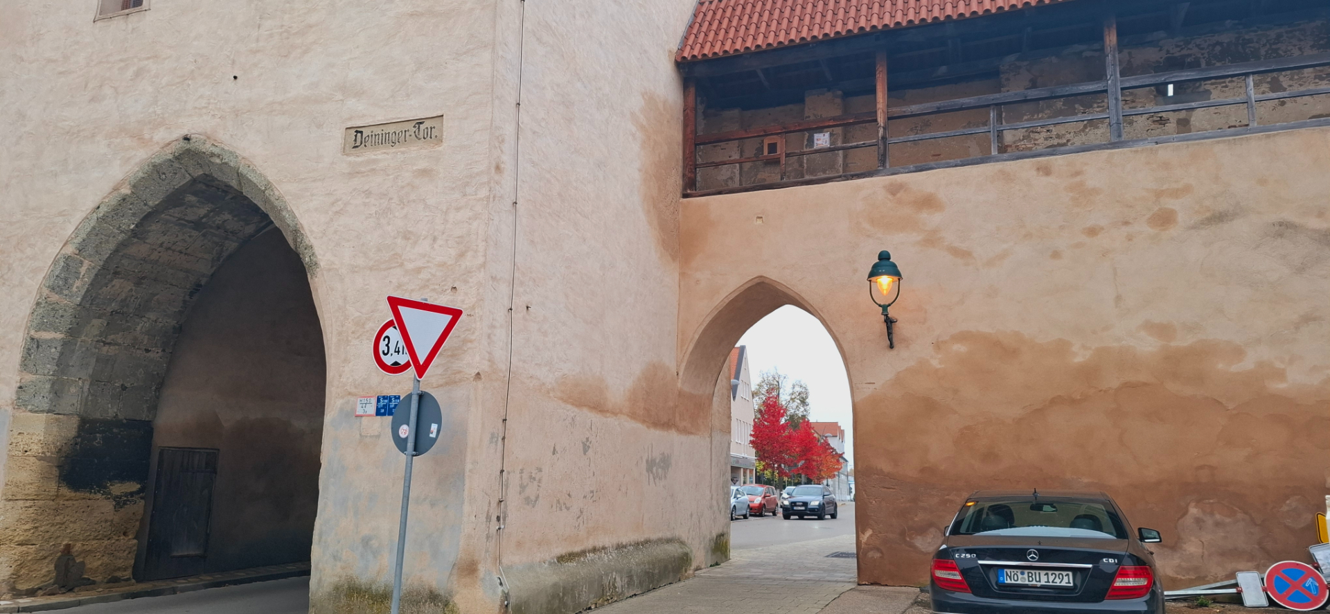 Крепостные укрепления Нёрдлингена хорошо сохранились, благодаря метеоритному камню, из которого они построены, потому и дожили до современности. Вошла в город через башню Дайнингер, а возвращаясь к вокзалу, вскарабкалась на башню и пошла от нее по стене опять к Дайнингер.
