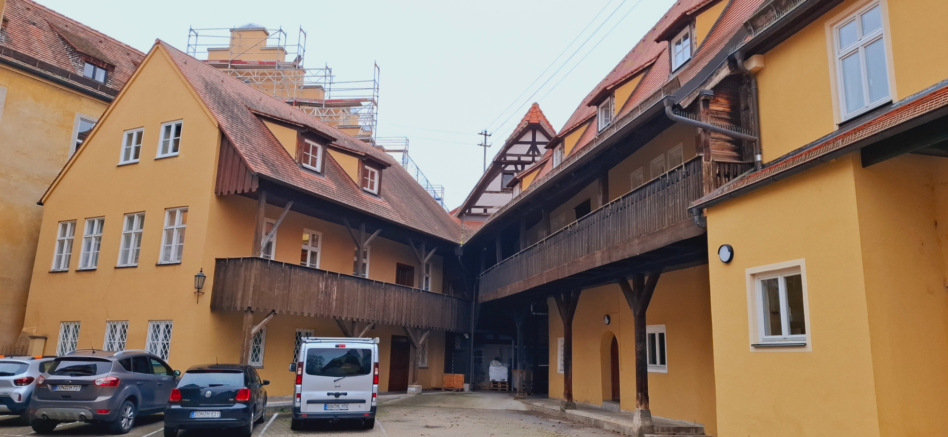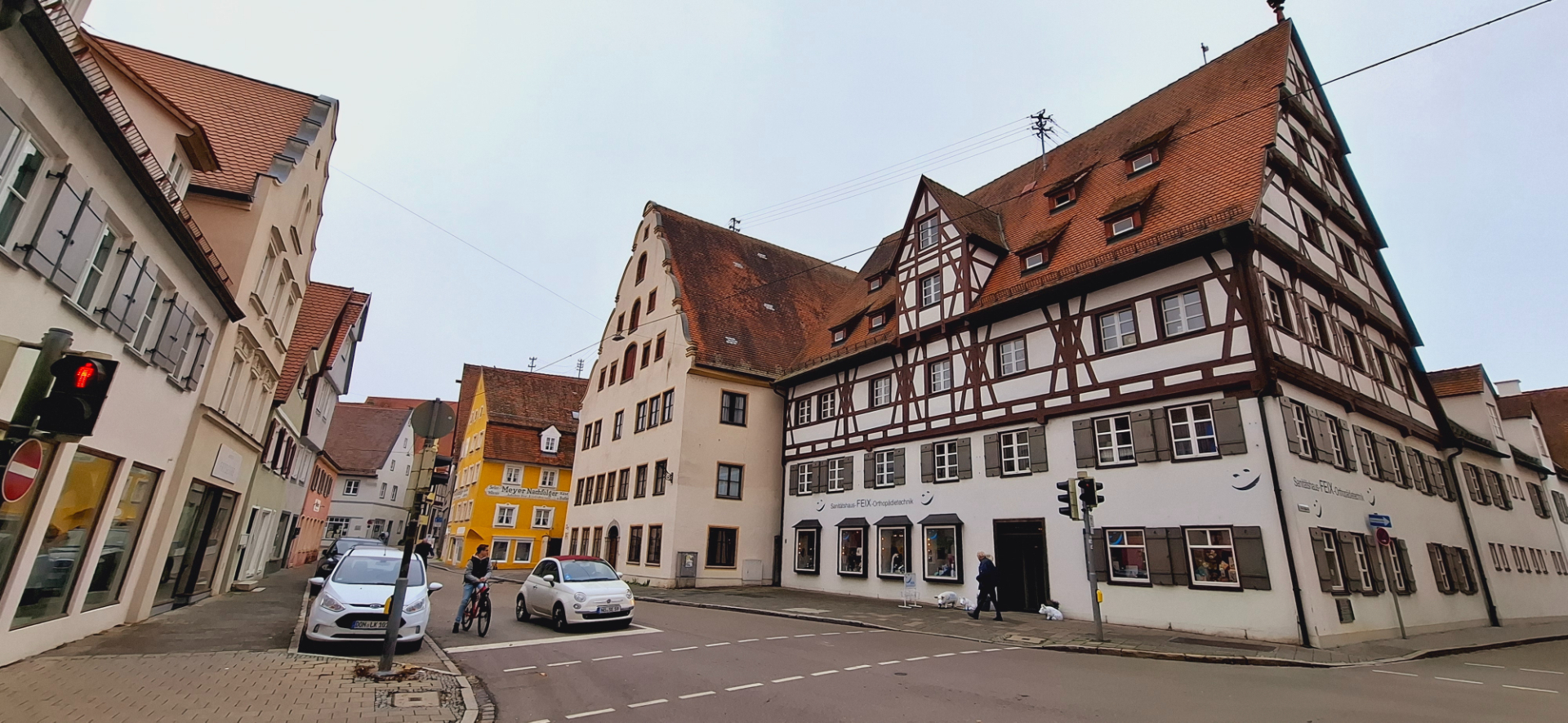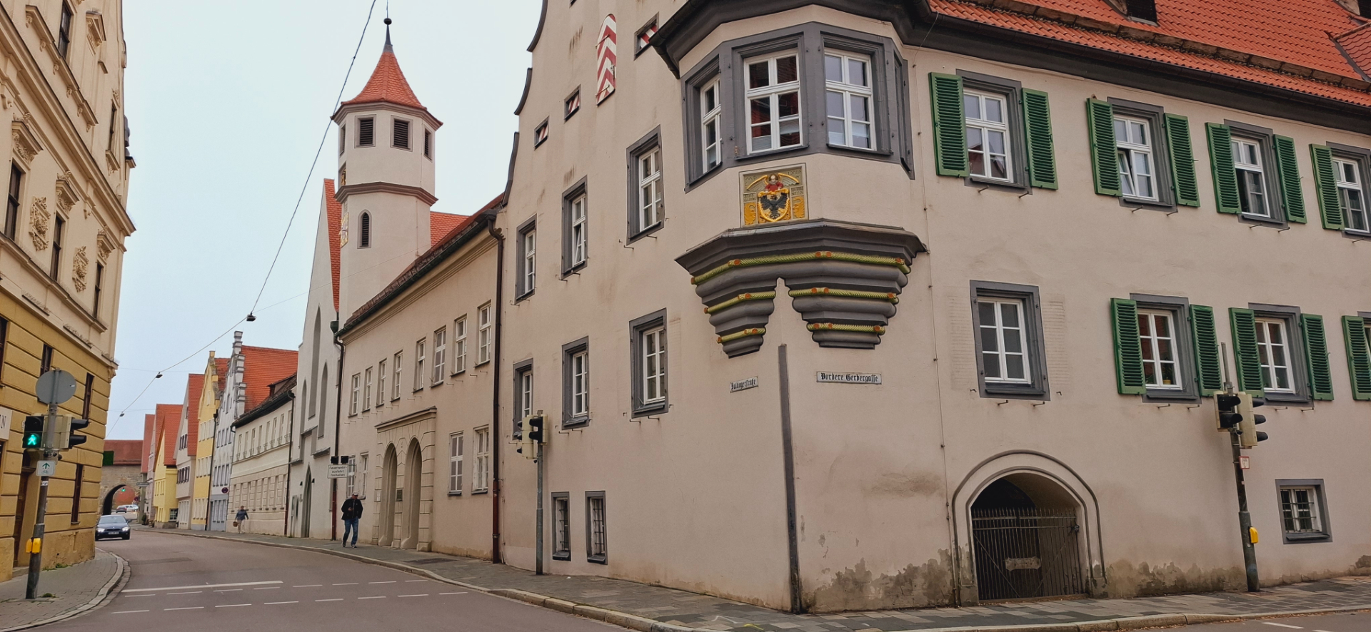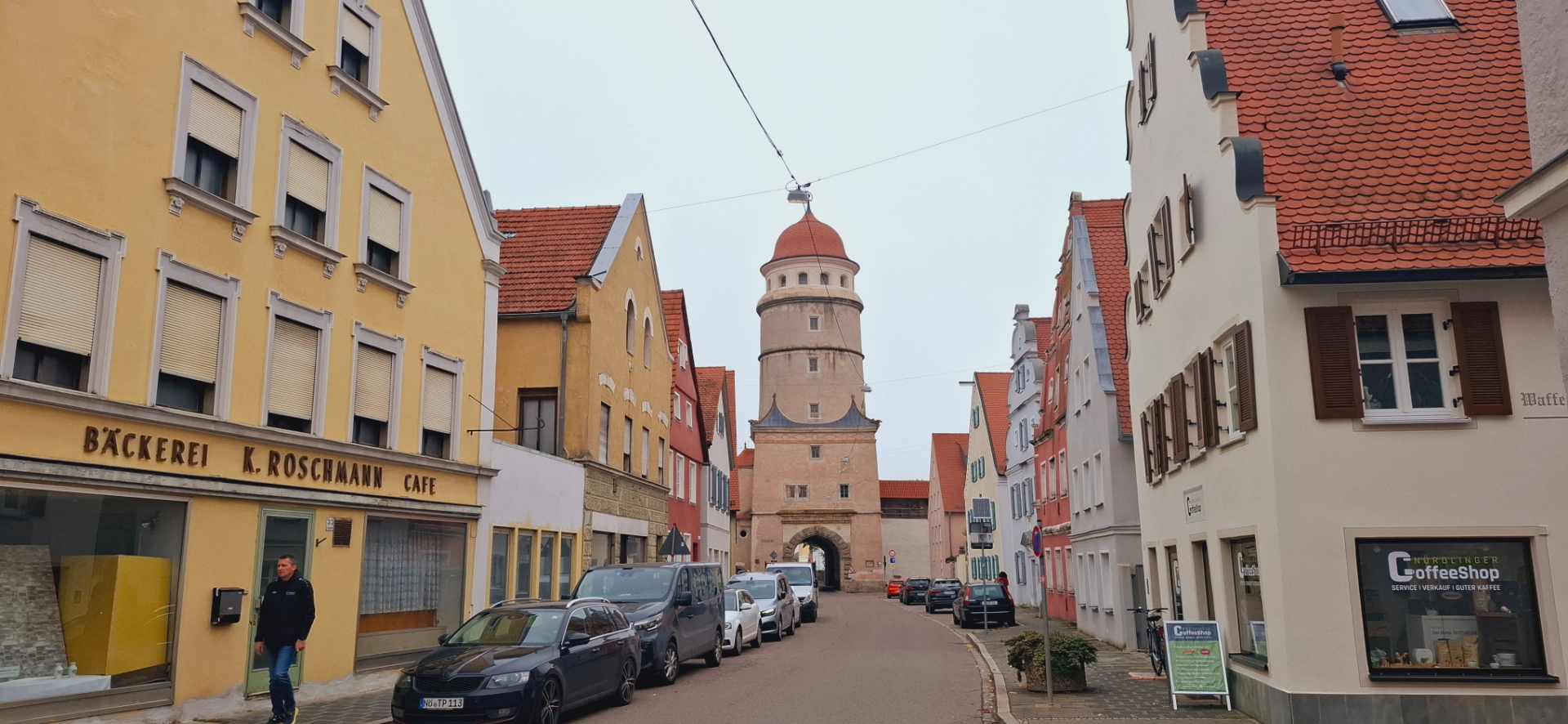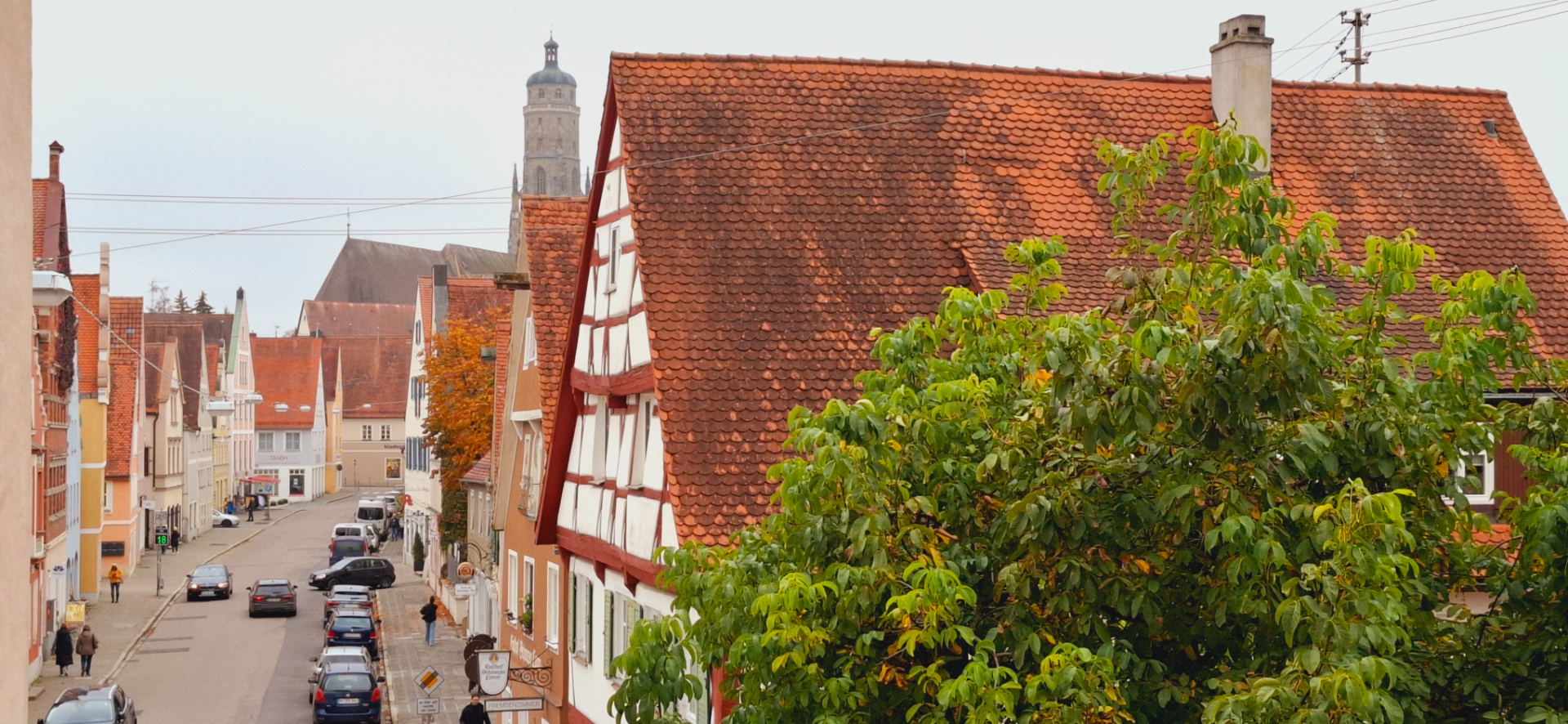 За музеем с храмом уже широкая улица туристического центра и здания соответствующие, высокие. Романтичные дома с красивыми фронтонами дома являются свидетелями высокой культуры строительства жилых домов мастерами Нёрдлингена. И до сих пор свидетельствуют о благосостоянии их владельцев, процветании горожан с XIV по XVI век.