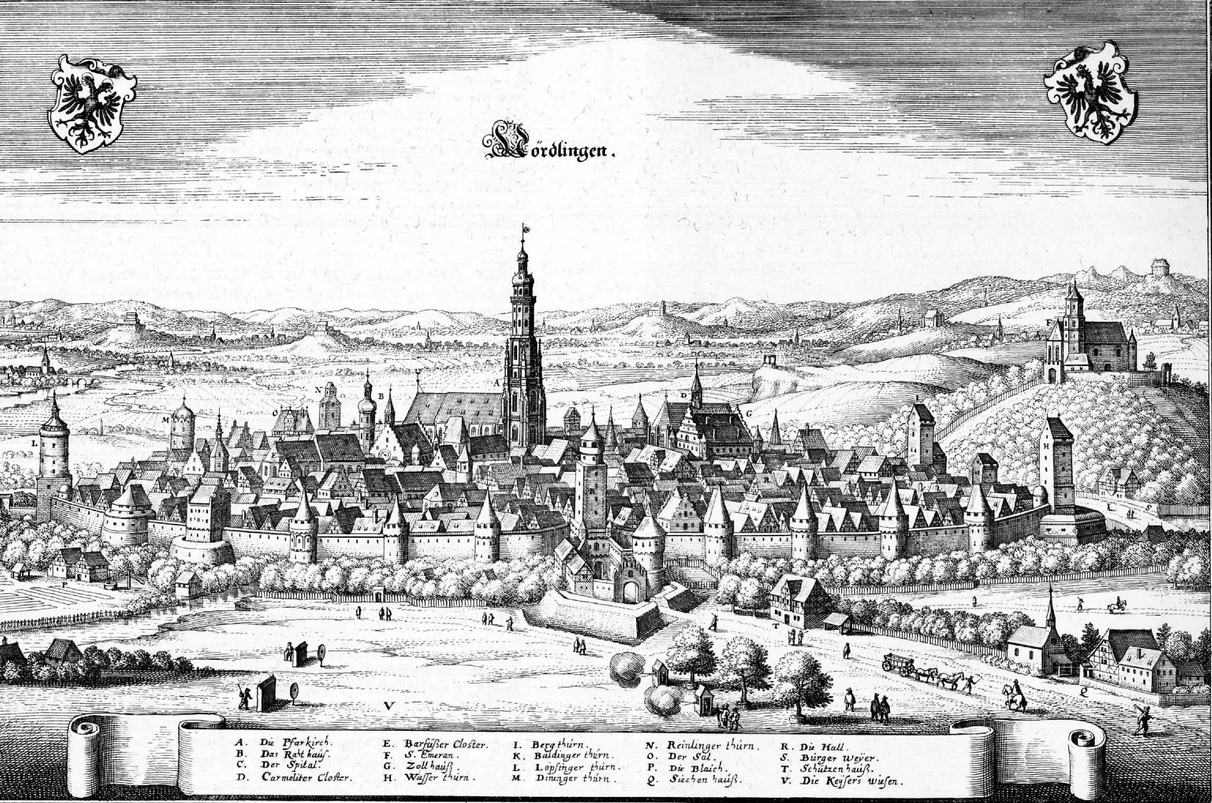 Нёрдлинген в Швабии, входит в «Romantische Straße»- «романтическая дорога» Германии. В Баварии есть 3 города сохранивших свои крепостные стены. Побывала до этого Ротенбурге-над-Таубером, теперь неминуемо сравниваю с Нёрдлингеном. Они во многом похожи, во многом - разные. Название города кажется схожим с «Норд» -северный, и «линген» - «место, где живут люди» или «родовое поселение». Это совершенно не так. Место связано с древнегерманским племенем норетунгов (Nordilinga), проживавшем в этих местах. И город находится знаменитой «Рисской чаше» - кратере, образовавшемся после удара огромного метеорита в этом месте о землю. Из звездного камня, содержащего алмазы, построена средневековая крепость Nordilinga, что способствовал ее сохранности на многие века. "Nordilinga" упоминается в Каролингских Хрониках. Селение принадлежало Каролингам еще в 898 году.