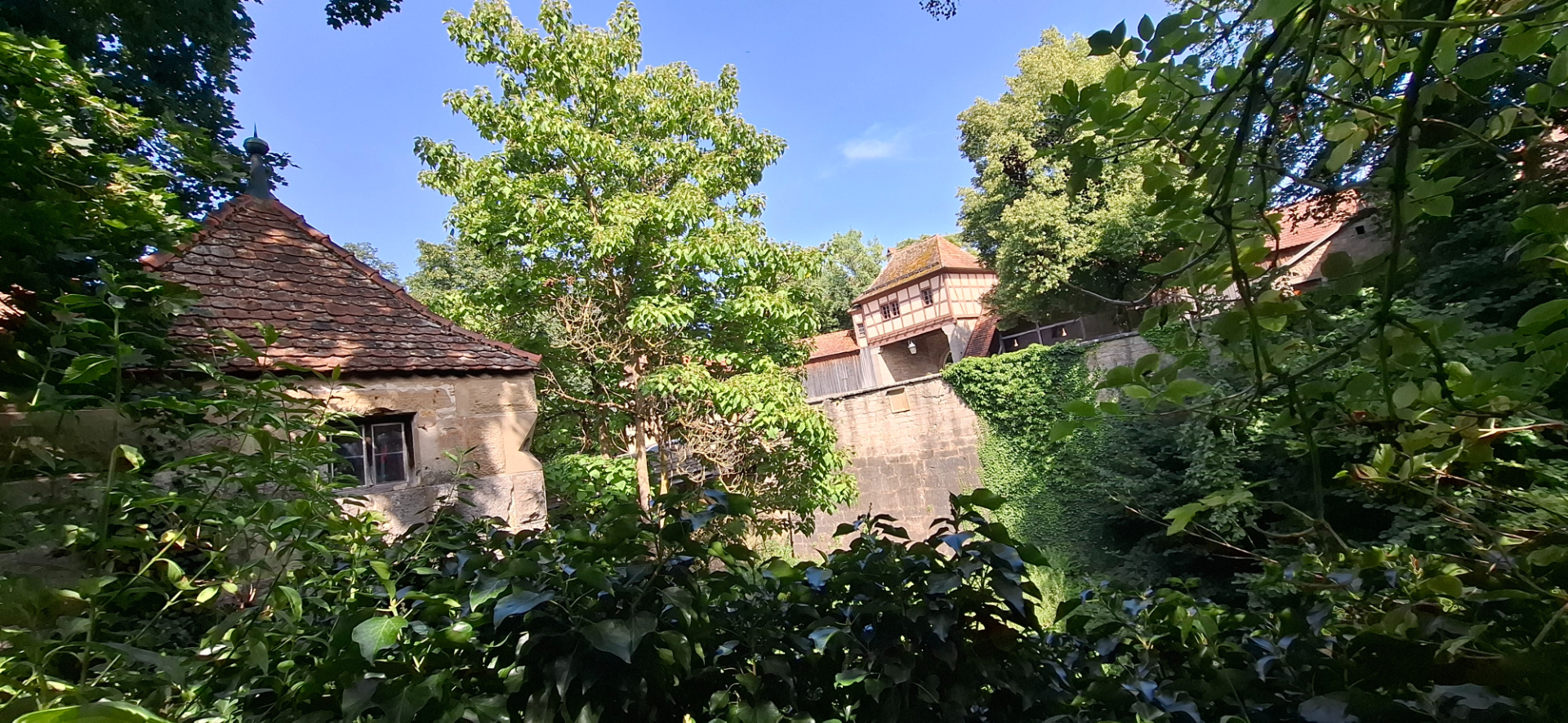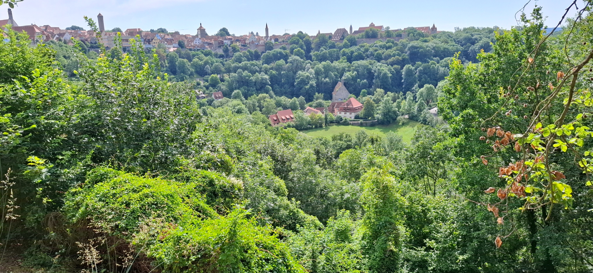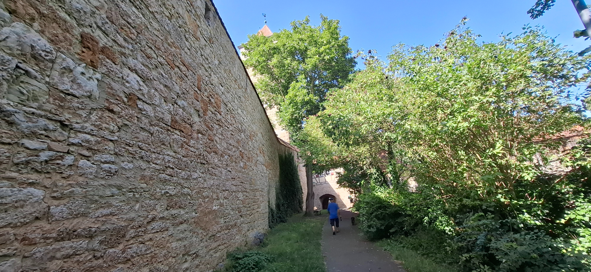 Если не проходить башню «Kobolzeller Tor» насквозь, а свернуть перед ней, окажемся на задах домов с тропинкой. Она приведет к обзорной площадке над долиной реки Таубер.