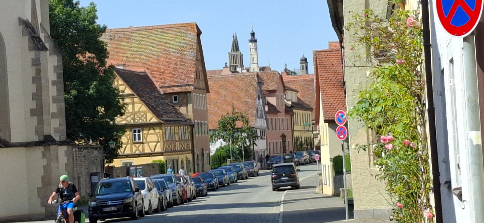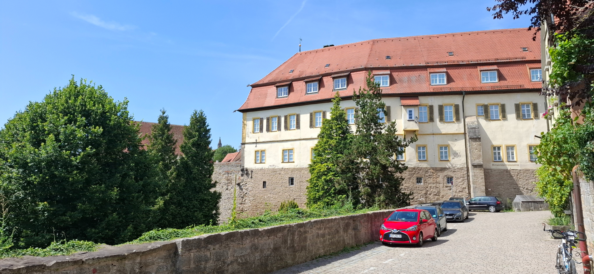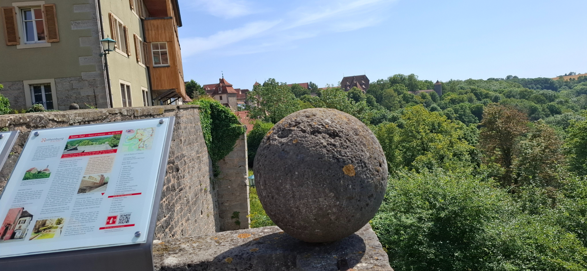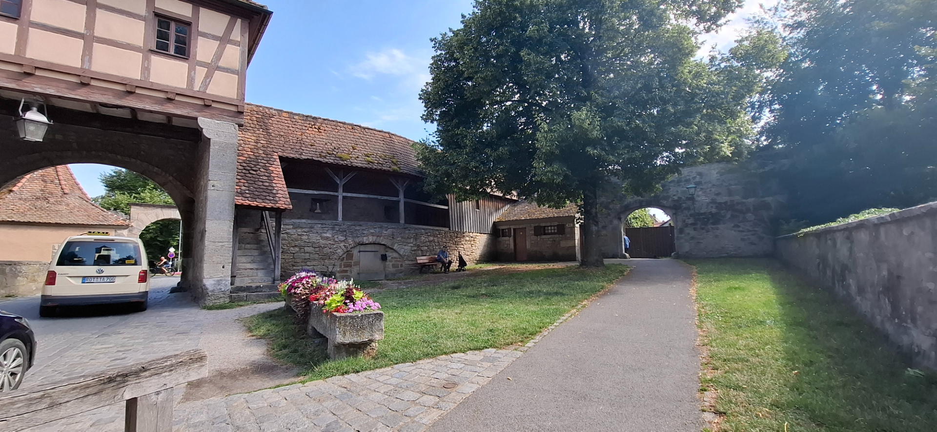 Если не проходить башню «Kobolzeller Tor» насквозь, а свернуть перед ней, окажемся на задах домов с тропинкой. Она приведет к обзорной площадке над долиной реки Таубер.