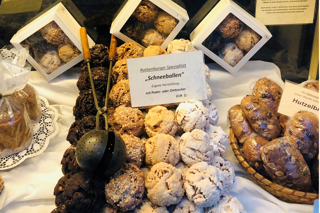 По пути много соблазнов - кондитерских. Угощают местным лакомством – "Ротенбургским снежком"/ Rothenburger Schneeball. Его делают из песочного теста, которое сначала нарезают полосками, а потом лепят из него шарик и посыпают сахарной пудрой, отсюда и название. Раньше такие "снежки" пекли на свадьбу и другие праздники, а сегодня их можно найти круглый год в каждой городской пекарне. «Снежки» зачастую сравнивают с нашим «хворостом». На мой вкус, «хворост» намного сочнее и слаще, даже без внешних дополнений.