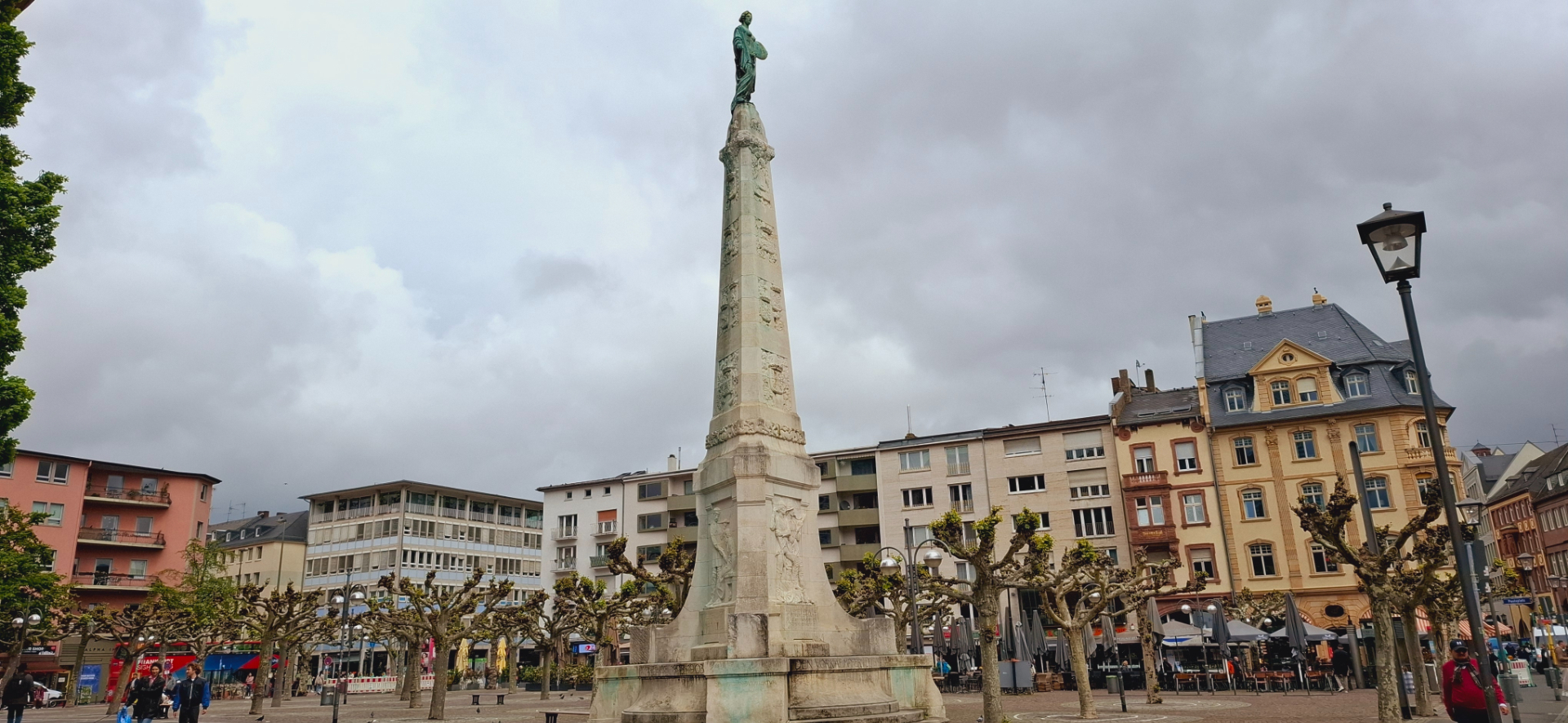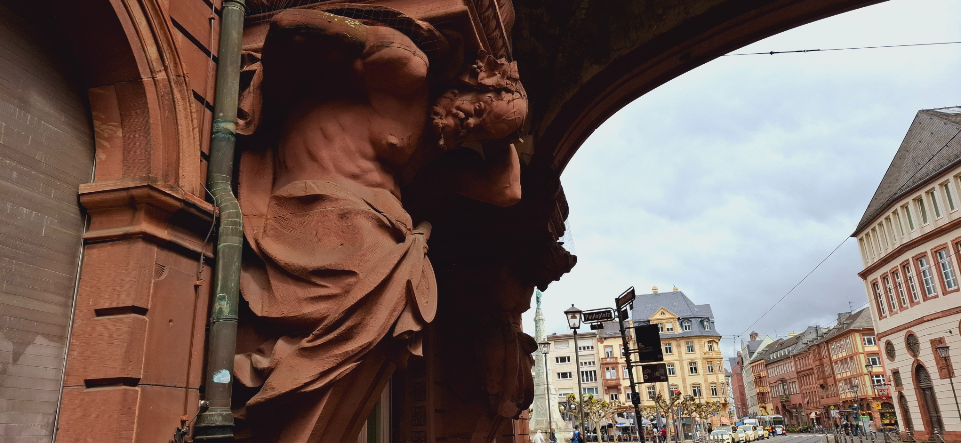 Рёмер-мэрия, была разрушена во Вторую мировую войну на 90 %. Новое здание ратуши Рёмер по старому проекту чуть правее, если смотреть от трамвайных путей. Говорят, когда-то ратуша получила своё название благодаря старинному пабу, расположенному в левой части здания, а сам паб - из-за формы бокалов, в которых подавали вино. На Центральных фасадах - «Римлянин», «Золотой лебедь» и «Старый Лимпург», слева и справа декорированы четырьмя статуями императоров Людвига II, Максимиллиана II и Карла IV. Но я посочувствовала атланту, что держит на себе здание. «Подсоби, а?...».