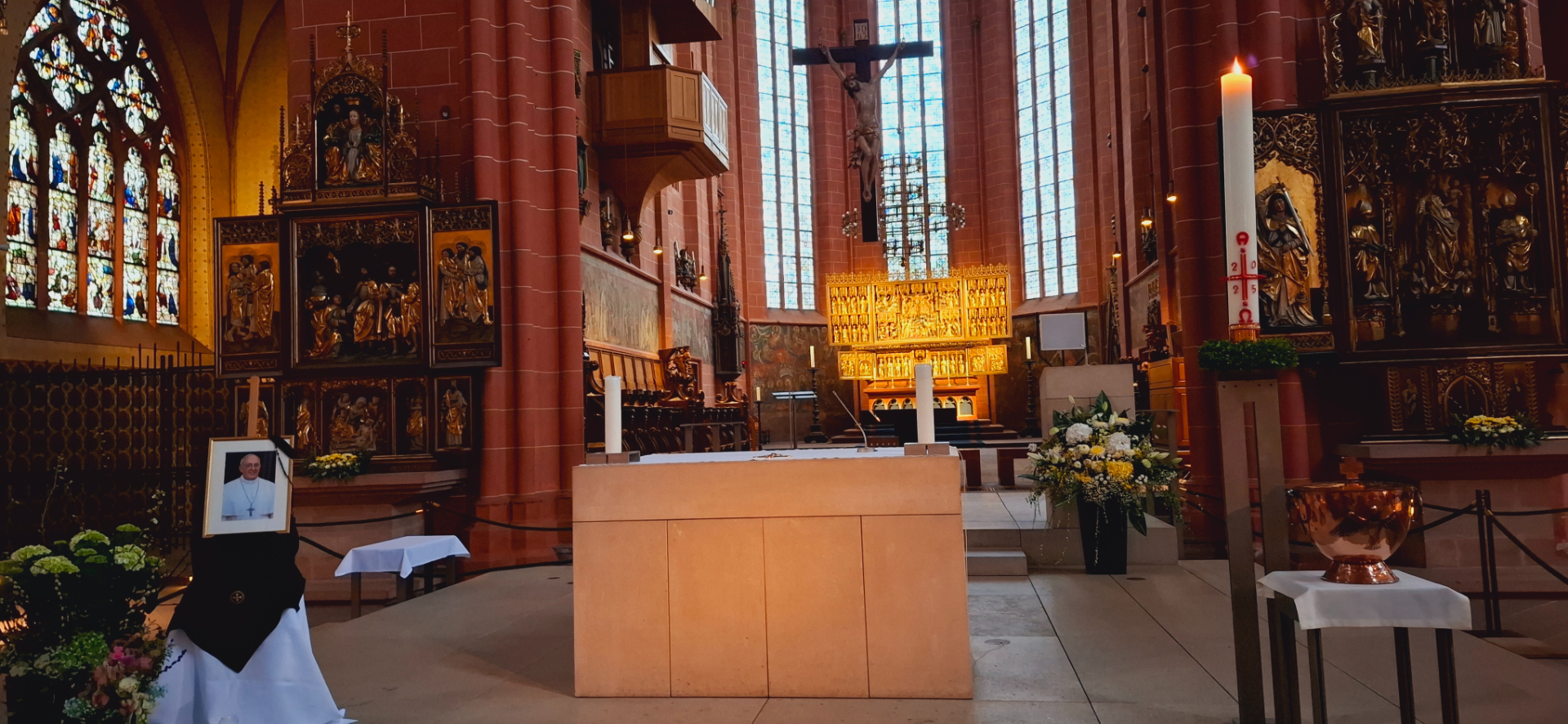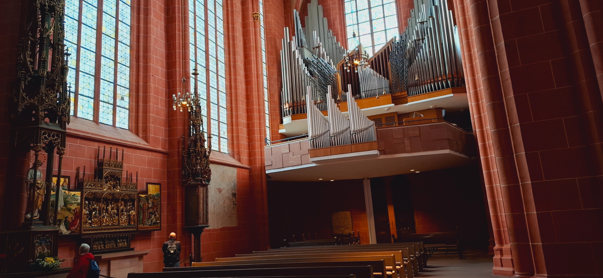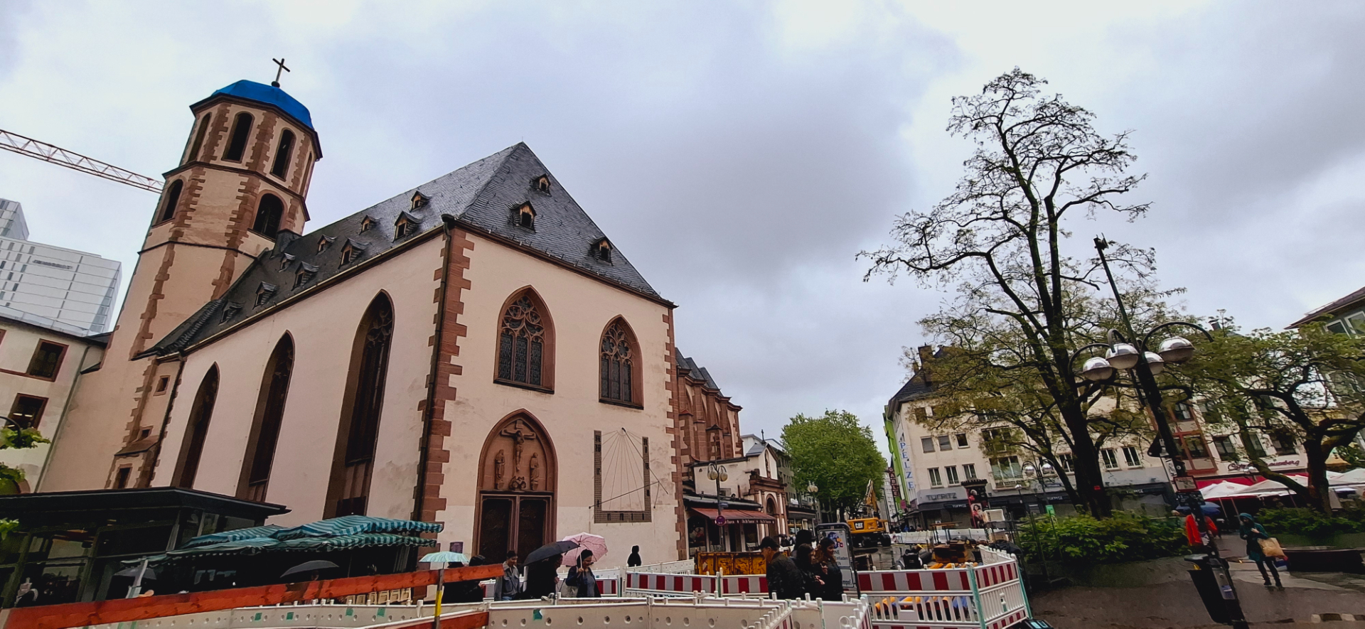 Рядом стоит Либфраэункирхе/Церковь Божией Матери, по сути, реконструкция разрушенного в войну храма. Но и старый храм неоднократно перестраивался в период в 14 по 16 века. Церковь оставалась католической и была частью епархии Майнца, даже когда во Франкфурте в 1533 году была введена Реформация. Сейчас она служит духовным центром региона Рейн-Майн.