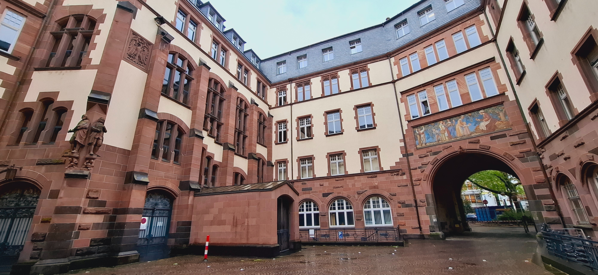 На углу солидное красно-белое здание. Во времена Средневековья на его месте стояла одна из главных башен Франкфуртского замка. В 1374 году здесь останавливался император Карл IV, в 1386-м – король Германии Вацлав IV (Венцель), а в 1475-м – император Фридрих III.