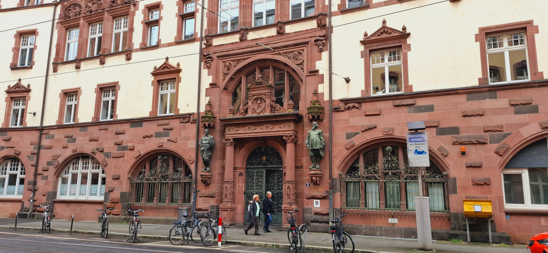 Перед зданием старинный фонтан. Украшен бронзовыми пластинами со старинными фигурами, символизирующими реки Майн и Рейн, льющими воду в чаши в форме раковин, которые поддерживают дельфинов, чьи пасти также служат источниками воды.