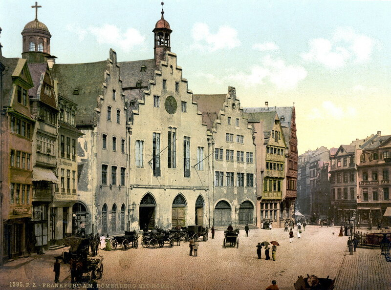 Нет традиционной немецкой средневековой ратуши в виде одного здания. Вместо неё почти квартал исторических зданий. Была, однако, когда-то маленькая старая Ратуша, но в ней стало тесно, было решено построить на ее месте большую новую. В 1405 году, отказавшись от уже готовых планов строительства, когда даже материалы были закуплены, городской совет приобрел для себя сразу три здания, принадлежавших богатым бюргерам - патрициям. И дальше город постепенно, в течение веков, выкупал у их собственников и приспосабливал под чиновничьи нужды. В добавленных домах, сооружались залы и просторные холлы. Ведь именно здесь, в Рёмере, избирались императоры Священной Римской империи, проходили пышные коронационные пиры. Построенный заново торжественный зал.