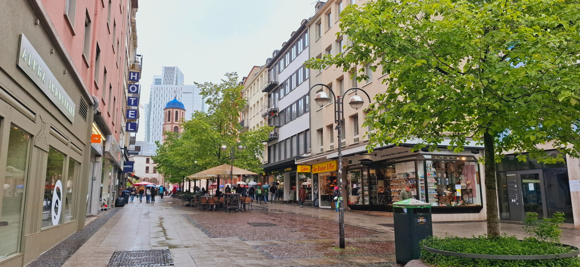От рыночка приятно идти по пешеходной улочке Neue Kräme. Некогда она была одной из центральных артерий Старого Города. По названию понятно, что в средние века Neue Kräme использовали как рынок для продажи посуды, стекла и различных предметов быта. В войну была разбомблена, как и весь город, частично восстановили, но участок между Paulsplatz и Neuer Kräme, где находилась старая фондовая биржа, нет. Как построили некоторые здания, опять образовалась улица между ними с 1968 года, стала пешеходной зоной, которая соединяет с севера на юг две крупные городские площади - Liebfrauenberg и Römerberg, а также доходит до реки Майн.