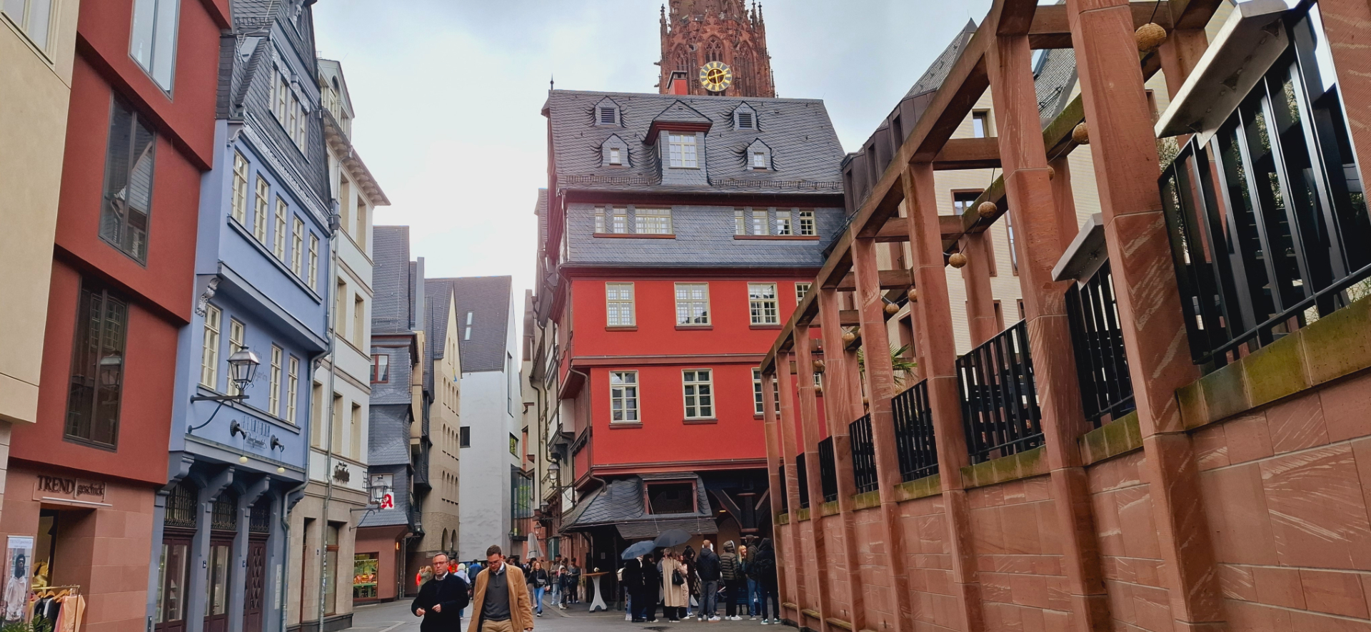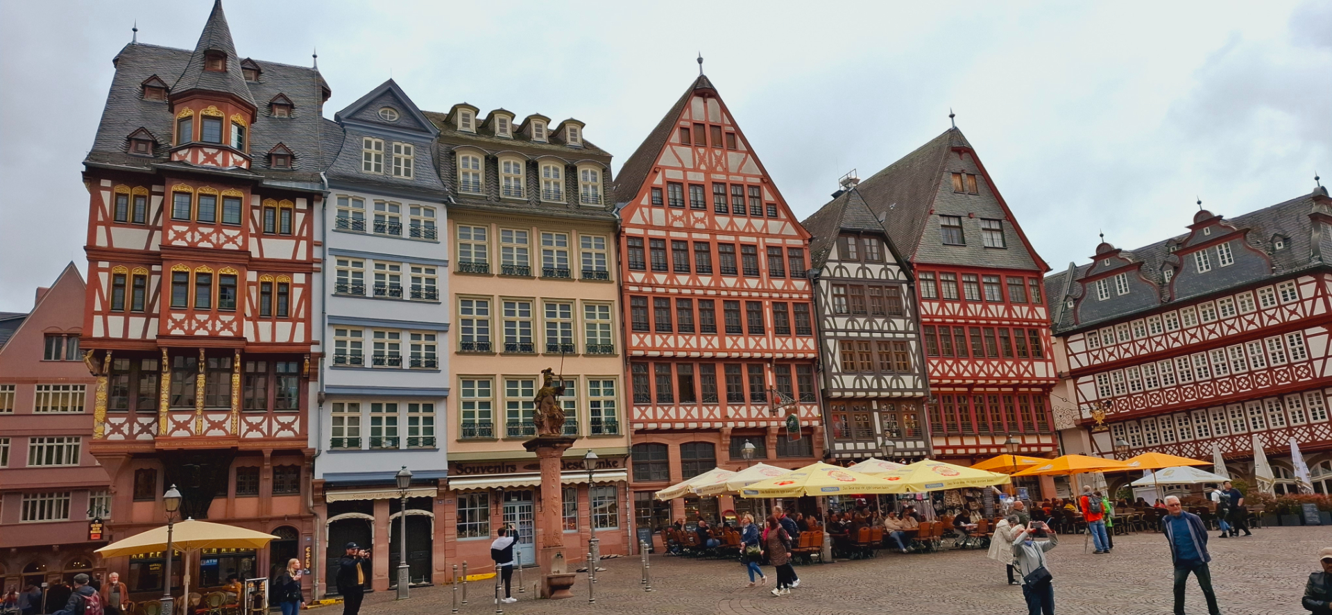 Вот и все, что кучно из старины стоит в «старом городе» района Инненштадт, исторический центр закончился. Во время Второй мировой войны район сильно пострадал. В результате американо-британских бомбардировок разрушено и сгорело дотла более двух тысяч фахверковых домов. Остальная старина в виде единично восстановленных зданий находится по другим уголкам Франкфурта.