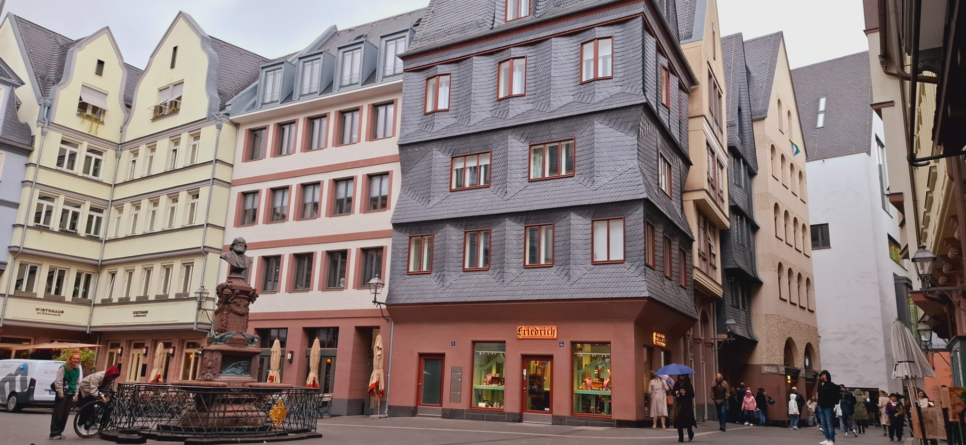 Дома - декорации вокруг площади, как и новодельная Ратуша. Ново-старенькие фахверки заново построенные, выстроились стеной вдоль одной стороны площади Рёмерберг. Среди них выделяется «Schwarzer Stern» - Чёрная звезда. Сам дом вполне беленький с красной окантовкой, но у него массивная черная крыша, может, из-за такое название. В проулке за ним до войны стоял знаменитый Соляной дом (Solzhaus), в планах и его заново построить.