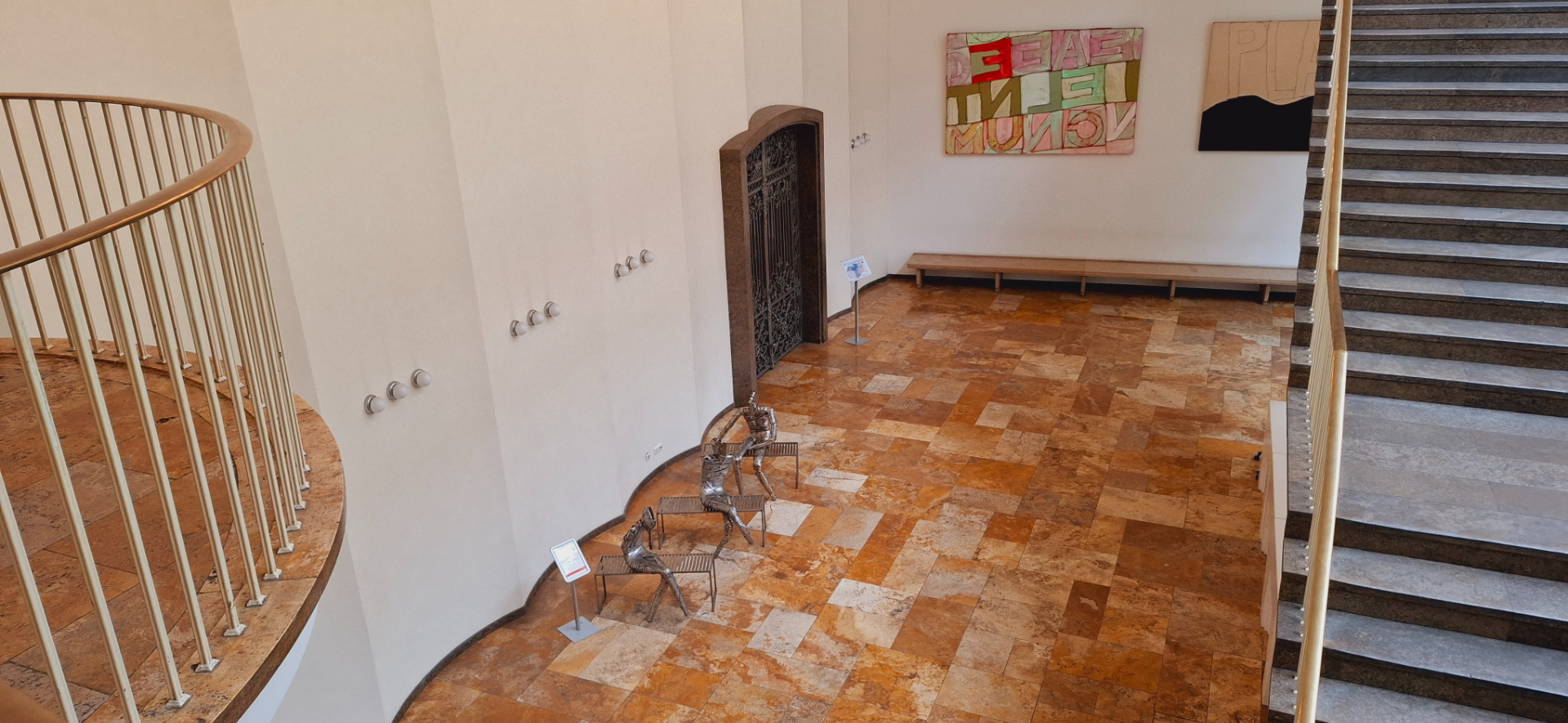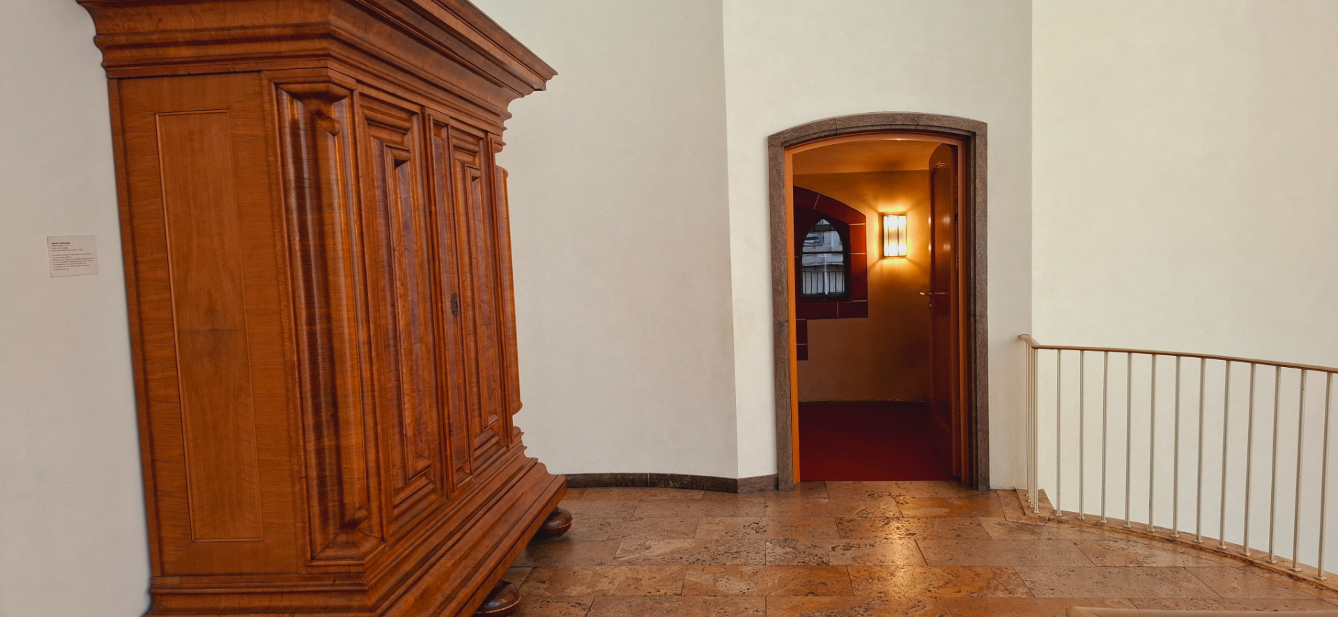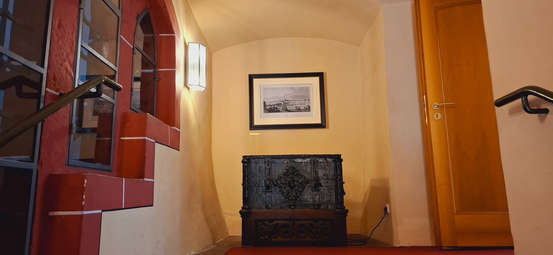 Внутри Ратуши все в духе нашего времени. Была возможность по старинной лестнице взобраться на 2-ой этаж внутрь строения. Современный холл и отделка, для антуража «старины» поставлен массивный шкаф, да сундук на лестнице.