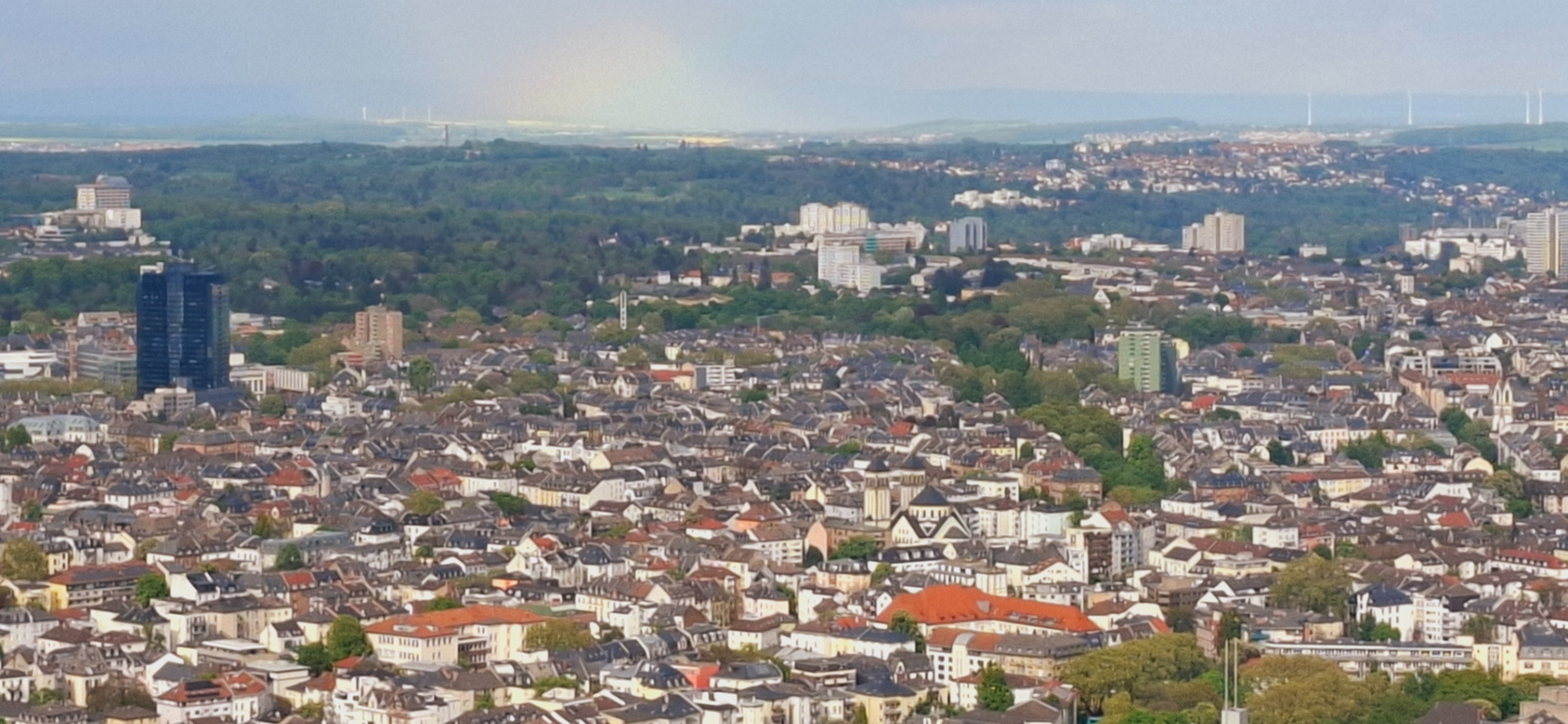 С высоты 55-ого этажа город можно рассмотреть во все стороны и горы Оденвальд вокруг. Где -то на горизонте желтая башня Гёте в огромном парке Франкфурта на окраине.