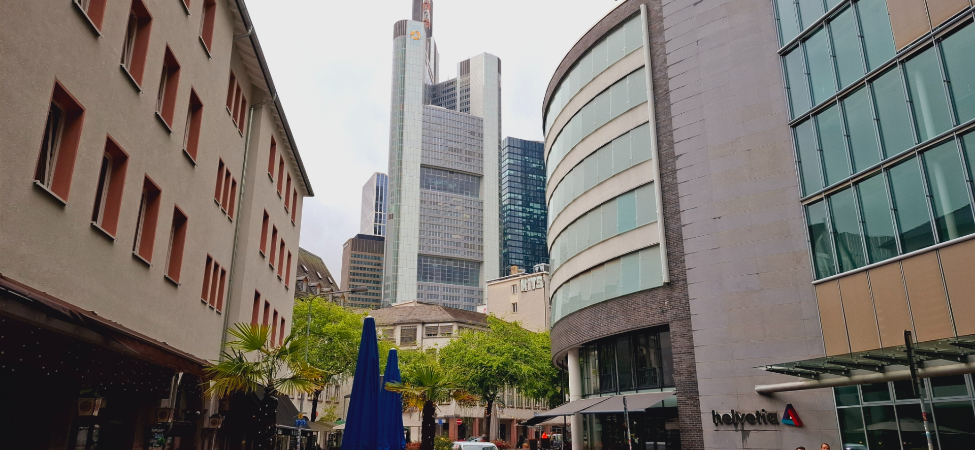 Во Франкфурте, в каком районе ни находишься, прямо или за углом - всегда видны небоскребы. Вот и мы поближе перемещаемся к новейшим, скорее, «под» новейшие достопримечательности города. Сами немцы называют все высотки Франкфурта-на-Майне «башнями». Местные небоскребы не стоят кучно в одном квартале города, разбросаны по многим районам. Рассматривая достопримечательности Франкфурта, трудно найти ракурс, при котором «старина» оказалась бы не на фоне какой-либо высотки.