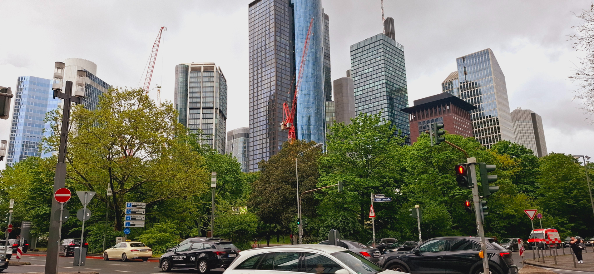 В городе насчитывается свыше 400 самых крупных кредитно-финансовых организаций, причем более половины из них относятся к иностранным банковским структурам. Франкфуртская биржа контролирует до 80% оборота всех фондовых ценностей в Германии и занимает первое место в континентальной Европе по объему оборота денежных средств. Для такого финансового мегалита нужны соответствующие здания. 43 высотных зданий, взметнувшихся в небо на 100-250 м, формируют Франкфуртский Skyline силуэт. У Франкфурта-на-Майне есть несколько прозвищ, одно из которых -"Майнхэттен". Основная часть небоскребов, в которых размещаются не только офисы, но и магазины, рестораны находятся в финансовом районе, известном как Bankenviertel. Европейский центральный банк - в «Eurotower», офис Drezden Bank в высотке SilverTower расположился. Не зря немецкое золотохранилище где-то тут в подземелье находится. Другие известные компании так же базируются в своих небоскребах. Самым высоким считается здание Commerzbank, насчитывает 56 этажей и имеет высоту 259 м. Его проектировали с учётом экологических требований. В «Коммерцбанк Тауэр» применяют современные технологии, которые контролирует отопление, вентиляцию и работу автоматических оконных «штор». Предусмотрены щелевые отверстия, поэтому окна, даже на верхних этажах, могут быть открытыми. В холодное время года щели внешней оболочки закрываются. Склеенные между собой полимерной плёнкой слои стекла не рассыпаются при ударе, а остаются висеть на плёнке, предотвращая выпадение и сохраняя целостность конструкции.
