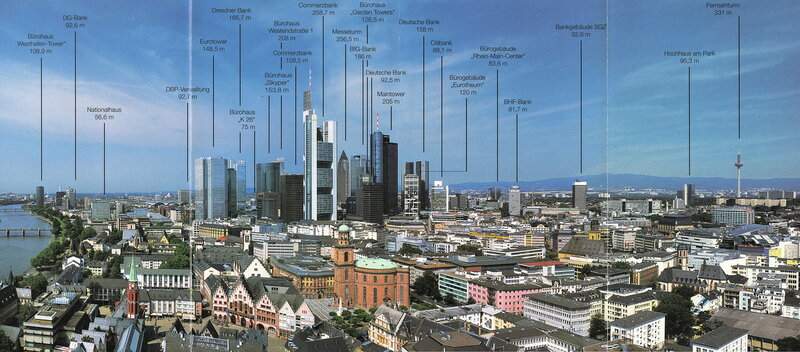 В большинстве небоскрёбов расположены офисы банков, страховых компаний и других финансовых организаций. Это привлекает специалистов со всего мира, почти треть жителей города - иностранцы. Названия высотки имеют в основном от компаний, банков внутри них, но есть и забавные. В названии башни Gallileo спрятана игра слов: хотя имя итальянского учёного и пишется с одной буквой «l», парк, расположенный возле здания, называется Gallusanlage. Здание Japan Center спроектировано на основе японской меры длины: одного мата татами (90 см × 180 см). В нём 27 этажей. Deutsche Bank - две башни с зеркальными фасадами. Высота башен-близнецов 155 метров. Небоскреб был построен в 1984 году.