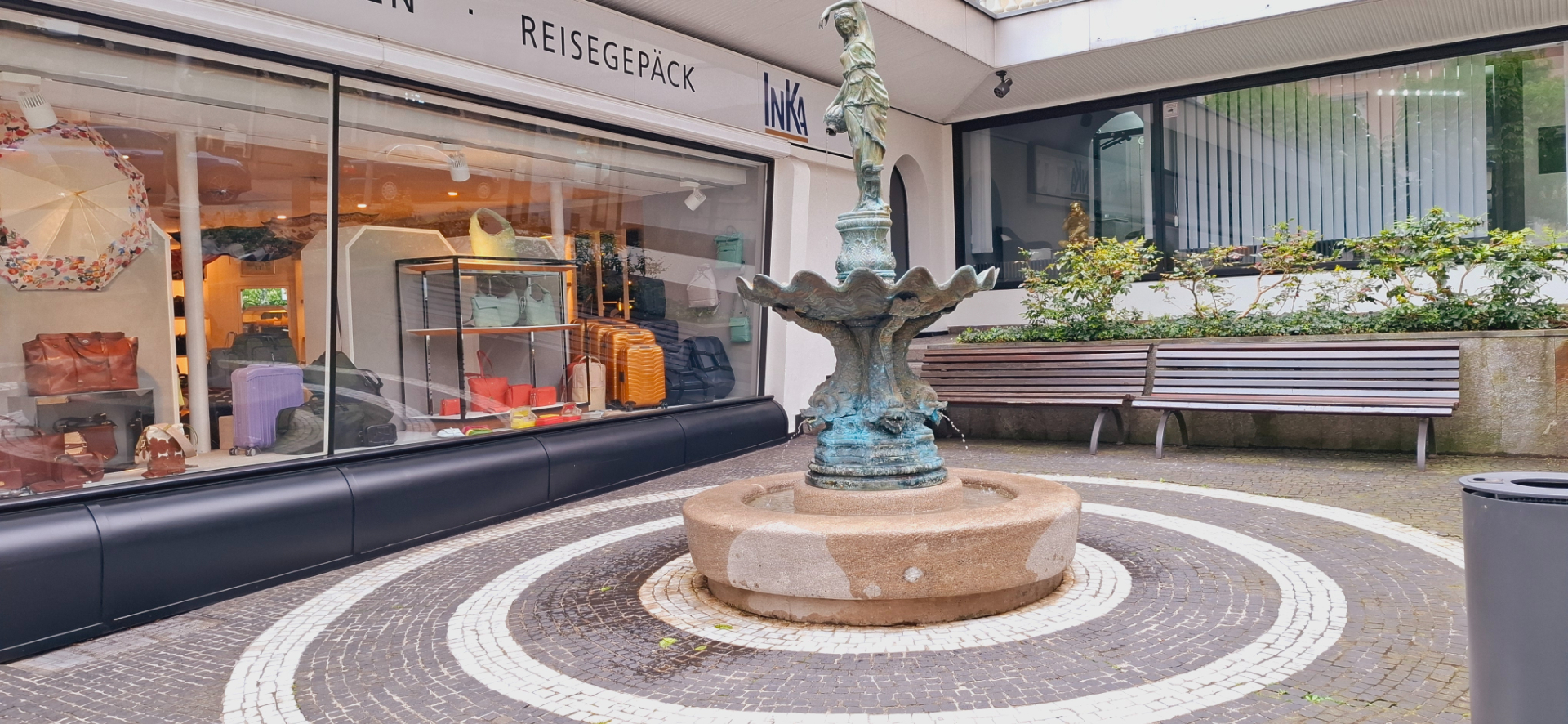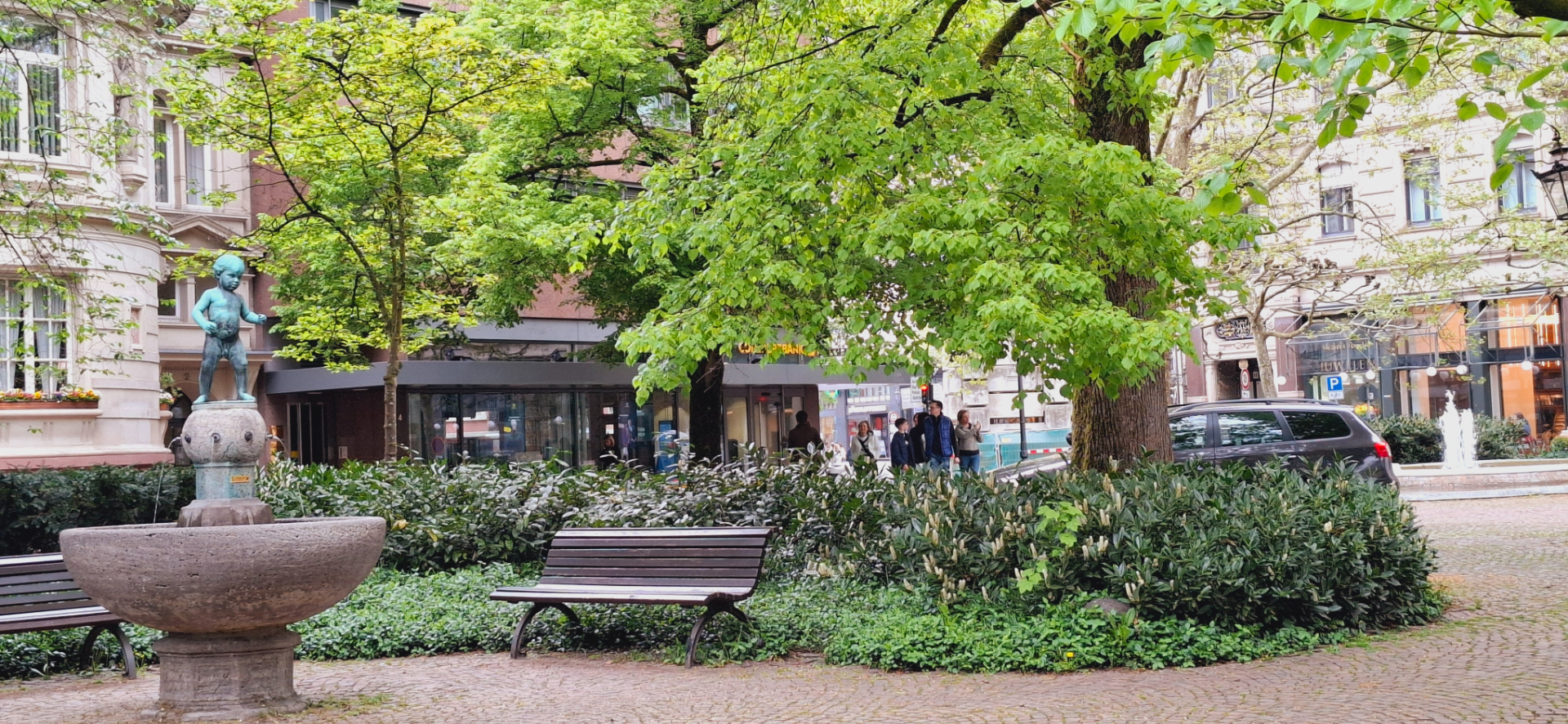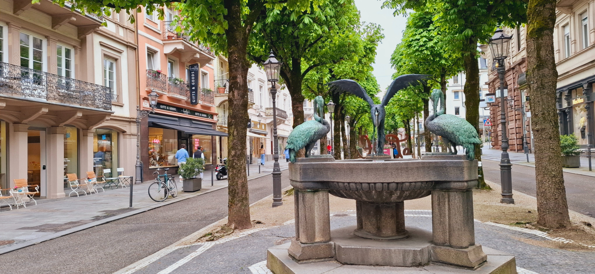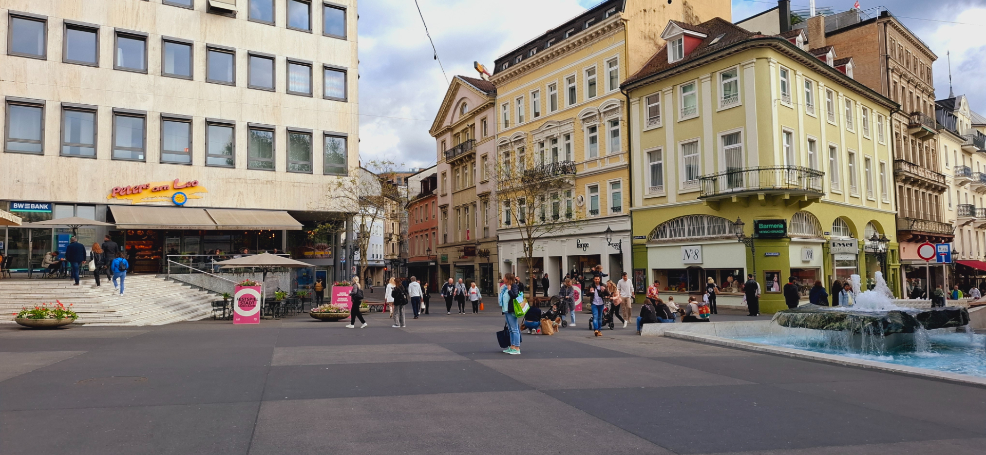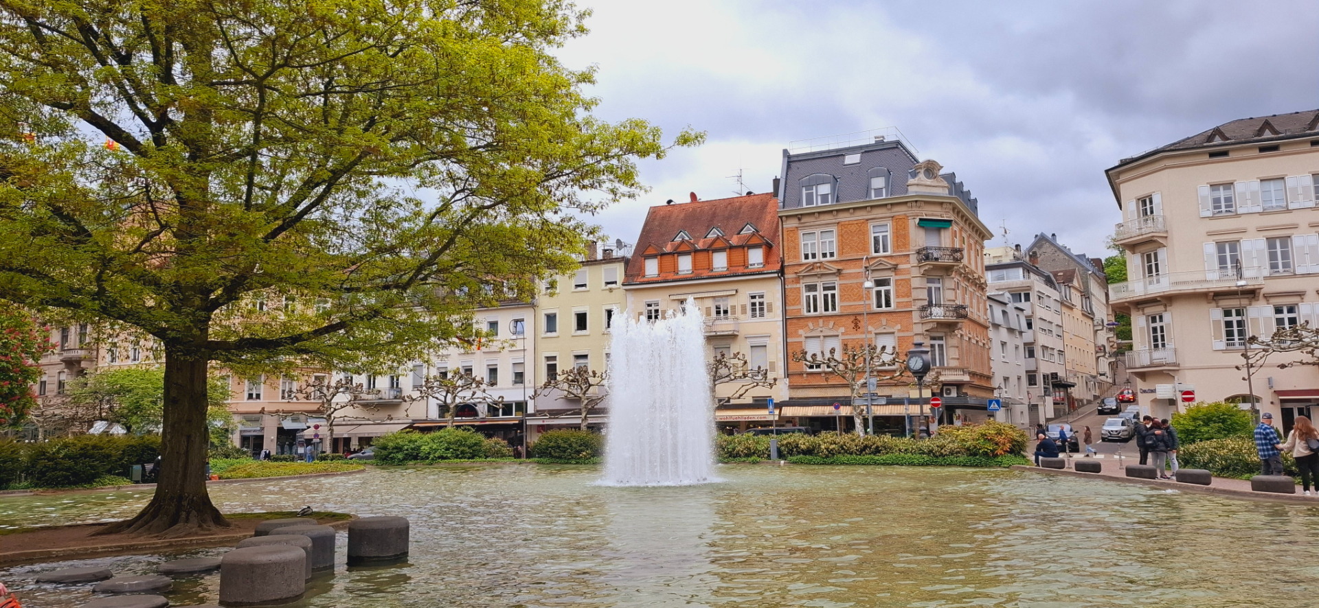 С "питьевой-купальной зоны" вышли, теперь сам город. Есть два вида отдыха в курортном месте: сначала оздоровляться, потом отдыхать:). Прекрасным релаксом после процедур, купален может быть неспешная прогулка по городу. В таком месте, как Баден-Баден, есть где похоlить и что посмотреть. Архитектурный облик центра города создают дома "югендстиле". Цветовая гамма совсем не яркая, тут превалируют все оттенки пастельных цветов, от светло-серого до нежно-розового. От фонтана с внушительным камнем наверху на площади Леопольда идут знамениты улицы курорта.
