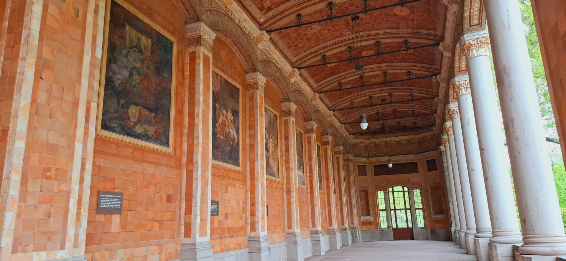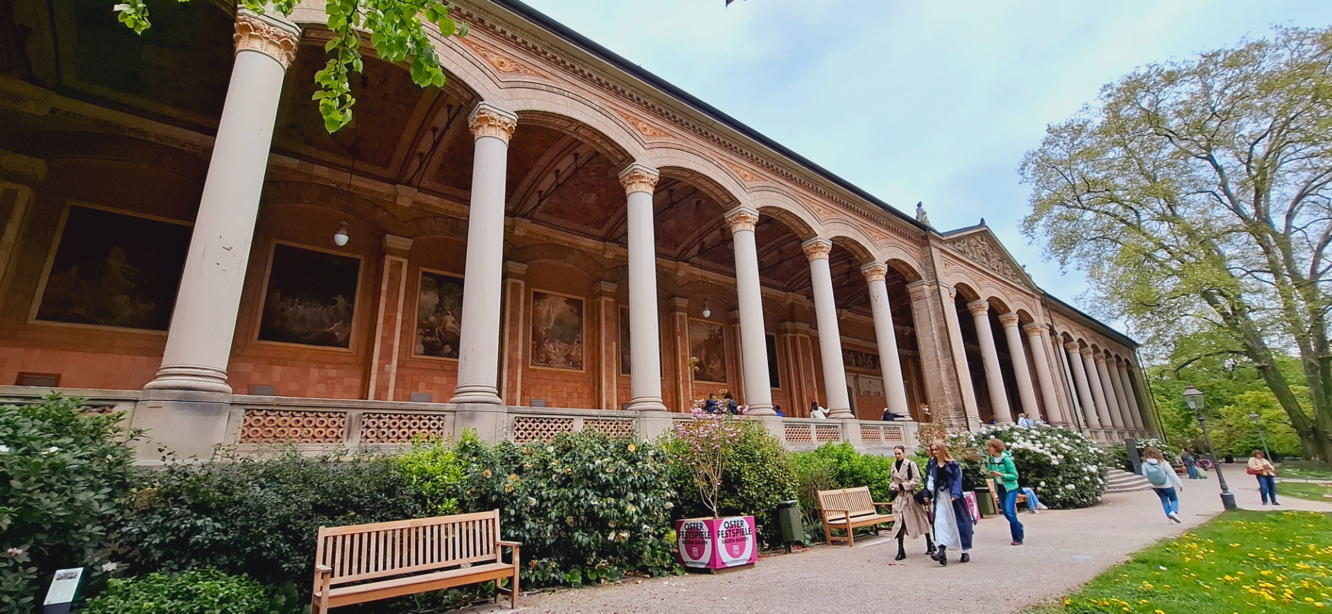 Самым красивым элементом сооружения является колоннада с 16-тью колонами, за которой есть проход на всю длину здания Pump Room. Задняя стена украшена 14 фресками, работы художника Якоба Готценбергер сделанная по эскизам другого известного художника Морица фон Швинда. Город находится в Шварцвальде, горном массиве региона Баден-Вюртембер, множество немецких сказок родом отсюда. Потому темами для фресок стали местные легенды и сказки. Есть и связанные с Баден-Баденом, можно увидеть старый замок и озеро Муммельзее, руины замка Эберштайн, монастырь Лихтенталь и часовню на горе Фремесберг Колоннада была местом прогулки после вкушения целебной воды. Считалось, что люди заходят слева - больными, фланируют, попивая водичку, проходят в центре Нимфу источника, и выходят направо уже здоровыми, что и показано на одном из барельефов.