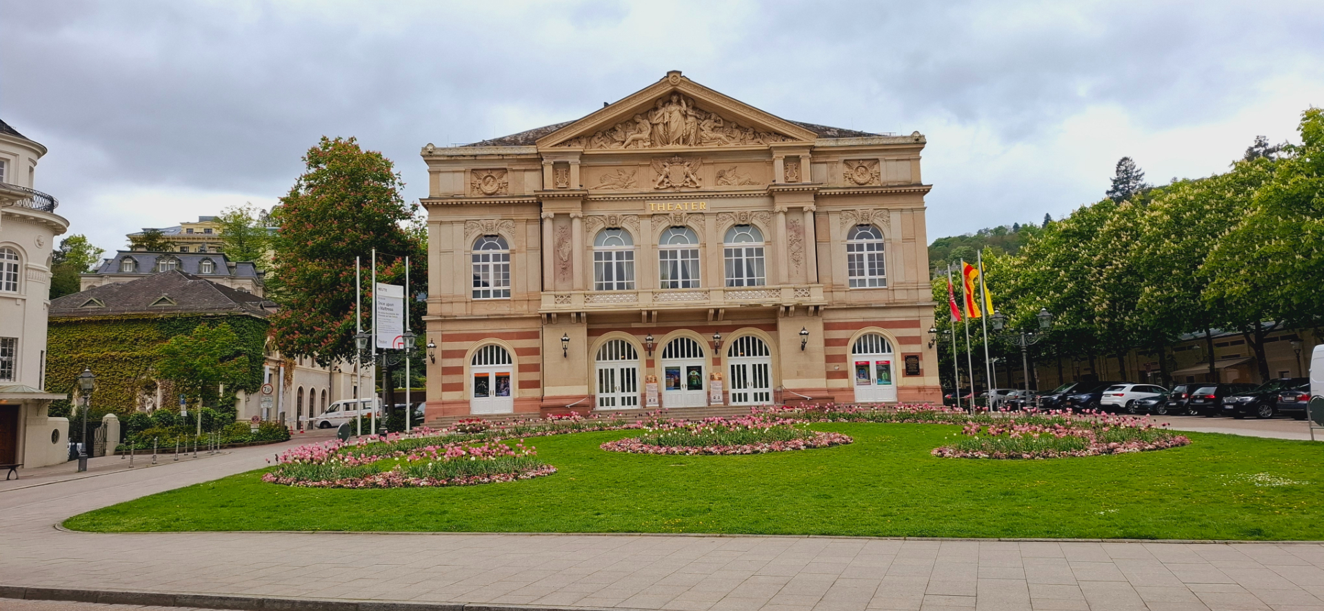 Отвлеклась от самого города, настолько Шварцвальд живописен. Вернемся в центр городка. На выходе из парка нарядное здание театра, построенное в 1862 году. Театр в стиле французского необарокко, инициатива постройки принадлежала хозяину казино, что находится напротив через дорожку, Эдуарду Беназье. Театр Баден-Бадена не только очаровывает своим восхитительным фасадом времен "бель эпок", но и благодаря своим театральным постановкам. В нем давали концерты следующие прославленные музыканты и композиторы: Россини, Штраус, Лист, Брамс. Единственный театр страны, который обходится без финансовой поддержки со стороны государства, полностью сам себя окупает.