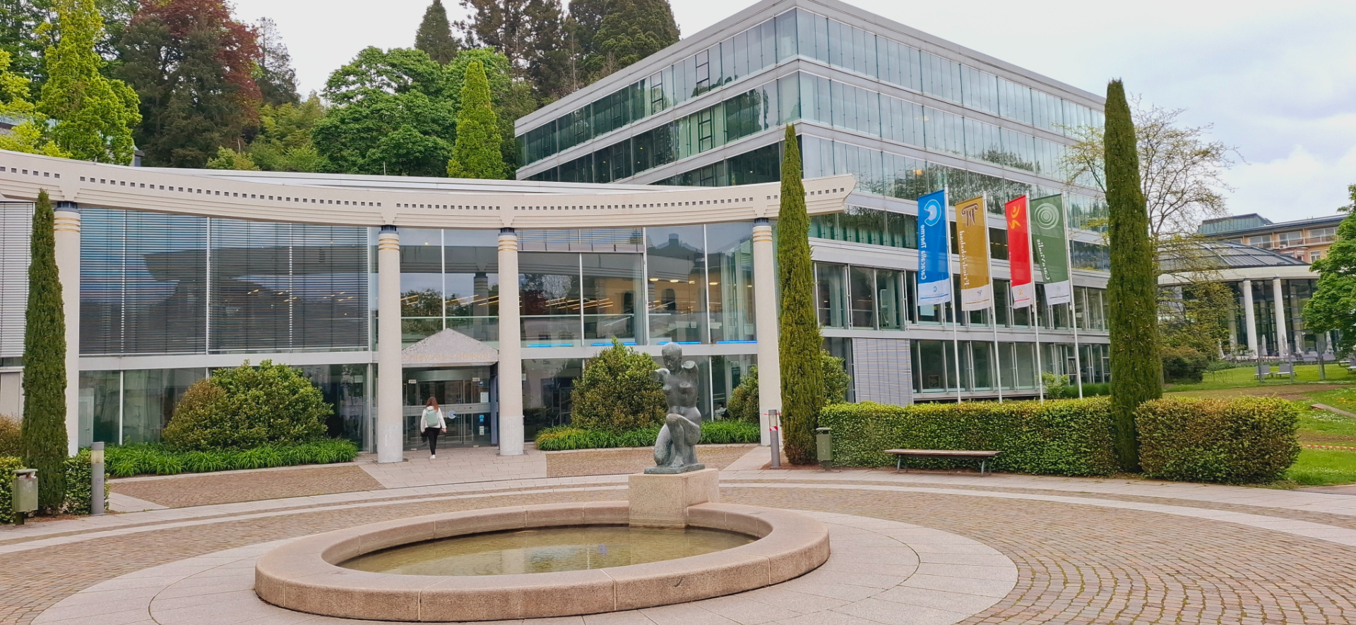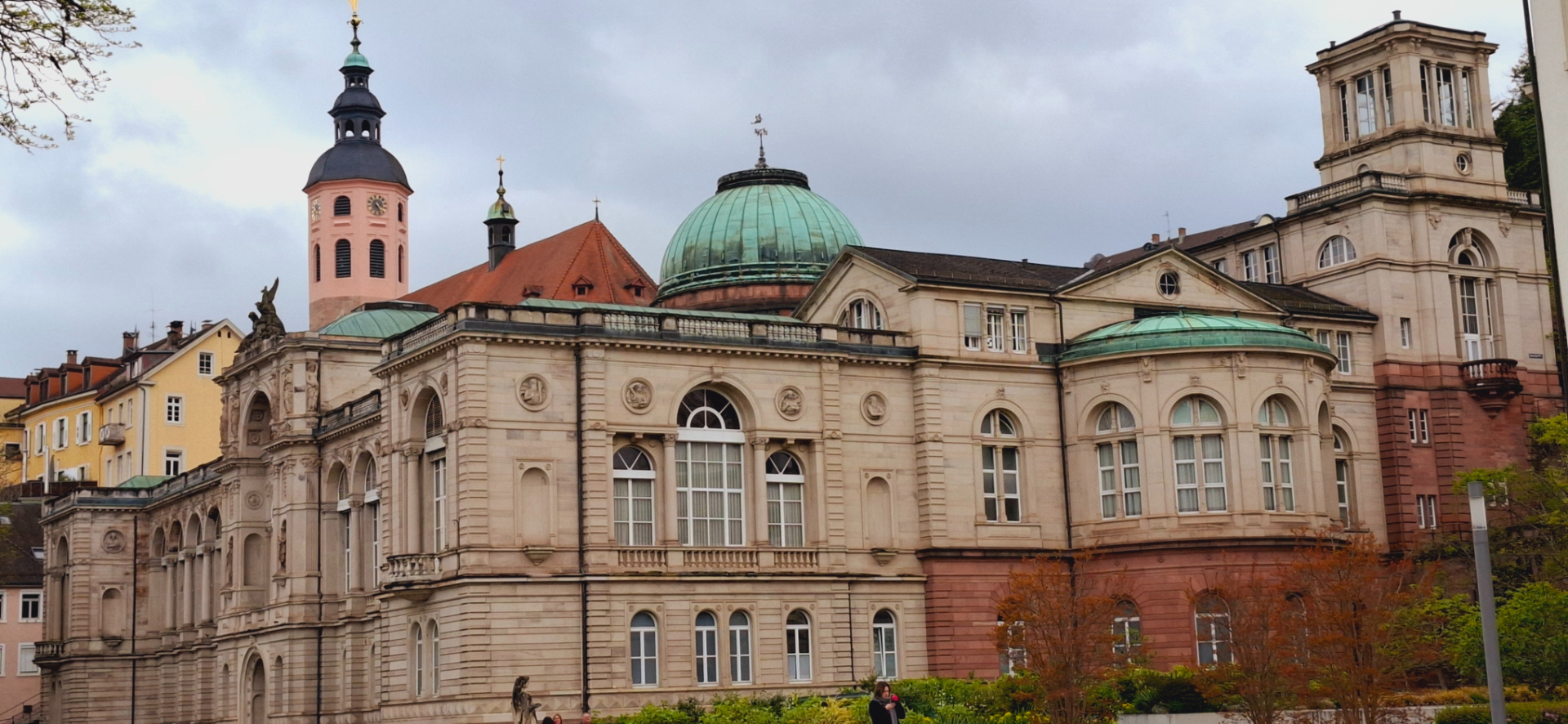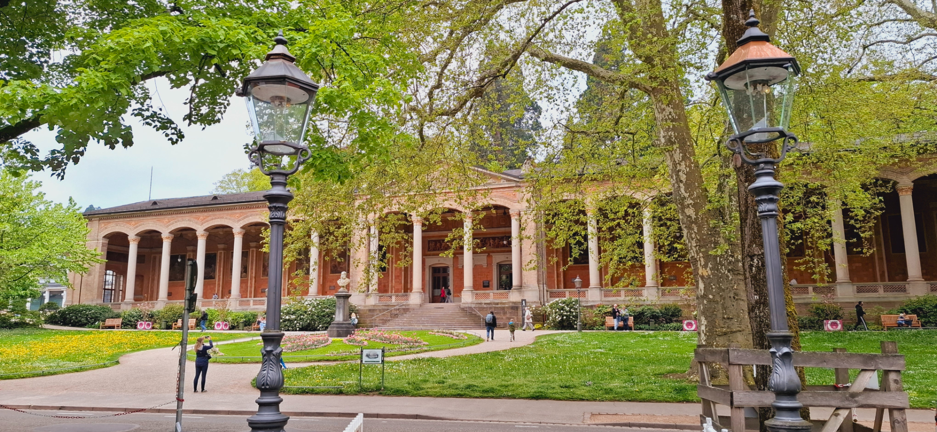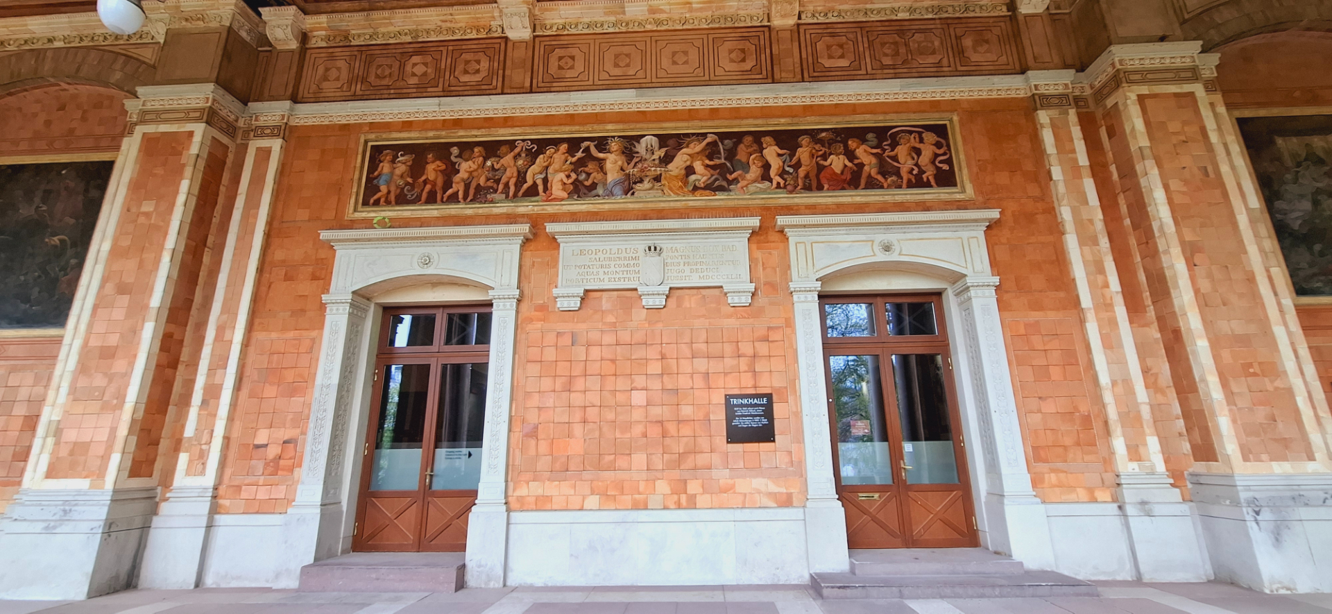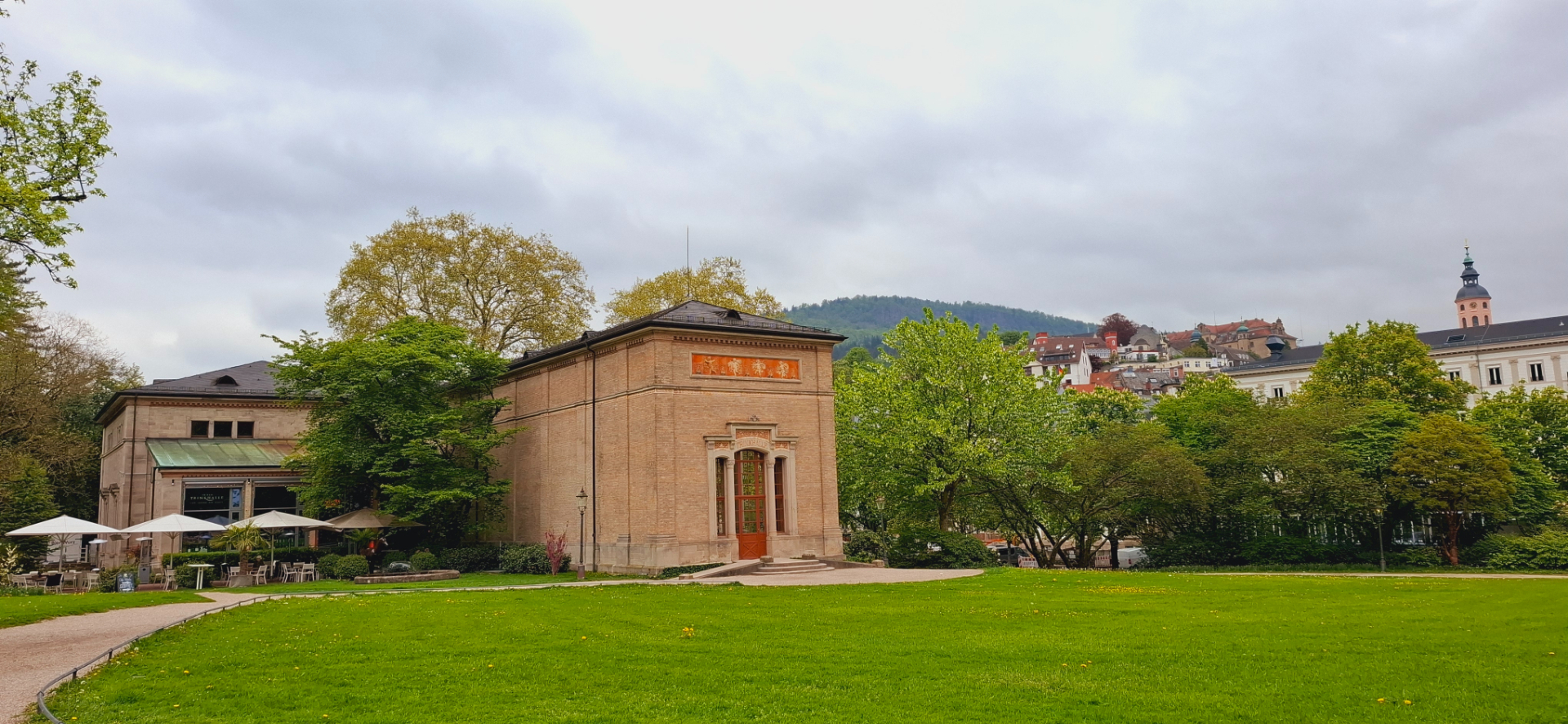 Почти рядом находится еще одна из достопримечательностей Баден-Бадена - Trinkhalle Pump Room 1839 года постройки. В Баден-Бадене функционирует порядка 20 источников, возраст некоторых из них составляет 12-17 тысяч лет. Главными считаются три: Фридрихсквелле, Мурквелле, Фетквелле. Температура воды трёх главных источников приблизительно равна 60-65 градусов. В описании курорта говорится, что лечение осуществляется и в термальных бассейнах, и питьевых павильонах.