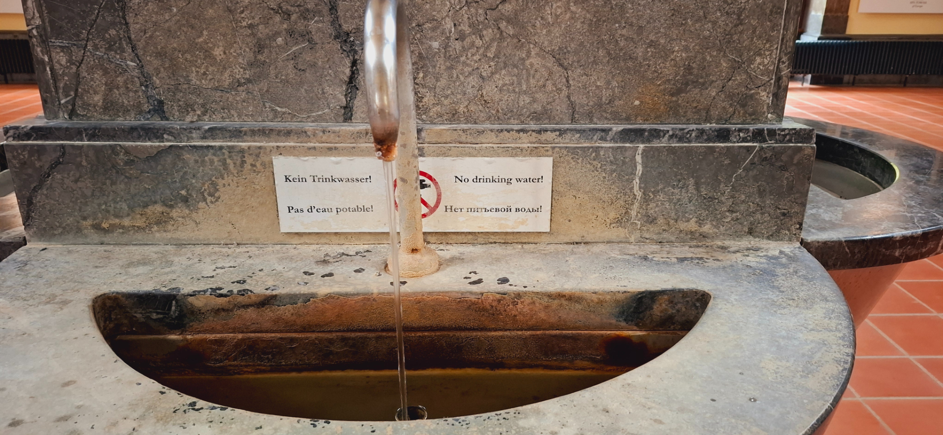 К павильону выходит штольня с минеральной водой из источников Friedrichsquelle и Heinrichsquelle. Внутри, как и ожидается, краны с питьевой минеральной водой. Только - ой ли, питьевой? Странное дело, воду не рекомендуют пить! Поразило в Баден-Бадене, что воду в специально построенных для питья сооружениях, употреблять не рекомендуется. При обращении за разъяснением к местным врачам, выяснилось, что пить можно, но на свой страх и риск. Наверное, все подводящие трубы старые, очистки воды нет. Потому и стал курорт «купальным», в отличие от старых времен, когда публика съезжалась потягивать водичку из бюветов. Теперь все на личное усмотрение и личную ответственность за последствия. Потому людей, набирающих воду в бокалы, бутылочки и потом прихлебывающих ее в прогулке по городу, вы здесь практически не увидите. Ну, а ныне, остается, как в старой шутке: «хочется на воды, принять терминальные ванны, бокал кремана, а не вот это вот все».