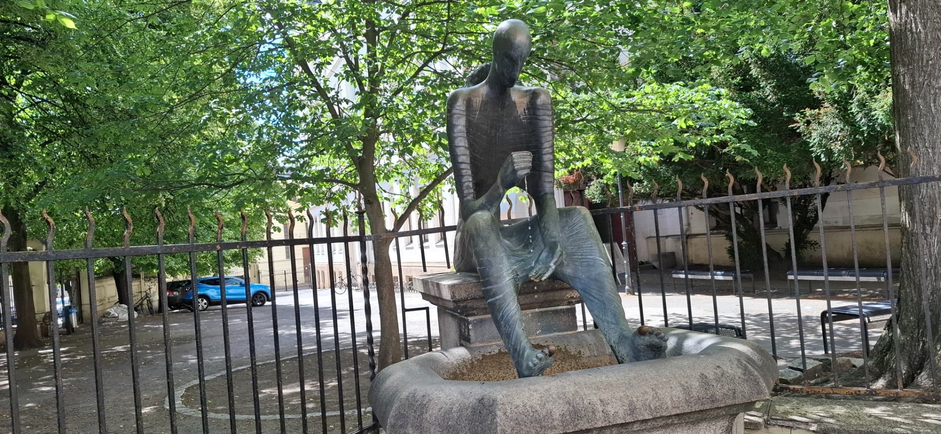 Не в центре, скорее с краю, стоит фонтан Святого Георгия на площади Верхнего рынка. Он за свою историю неоднократно места стояния менял. Считается, что он был построен в 1590 году и уже тогда был украшен скульптурой воина и головами горгулий, которые можно увидеть сегодня.