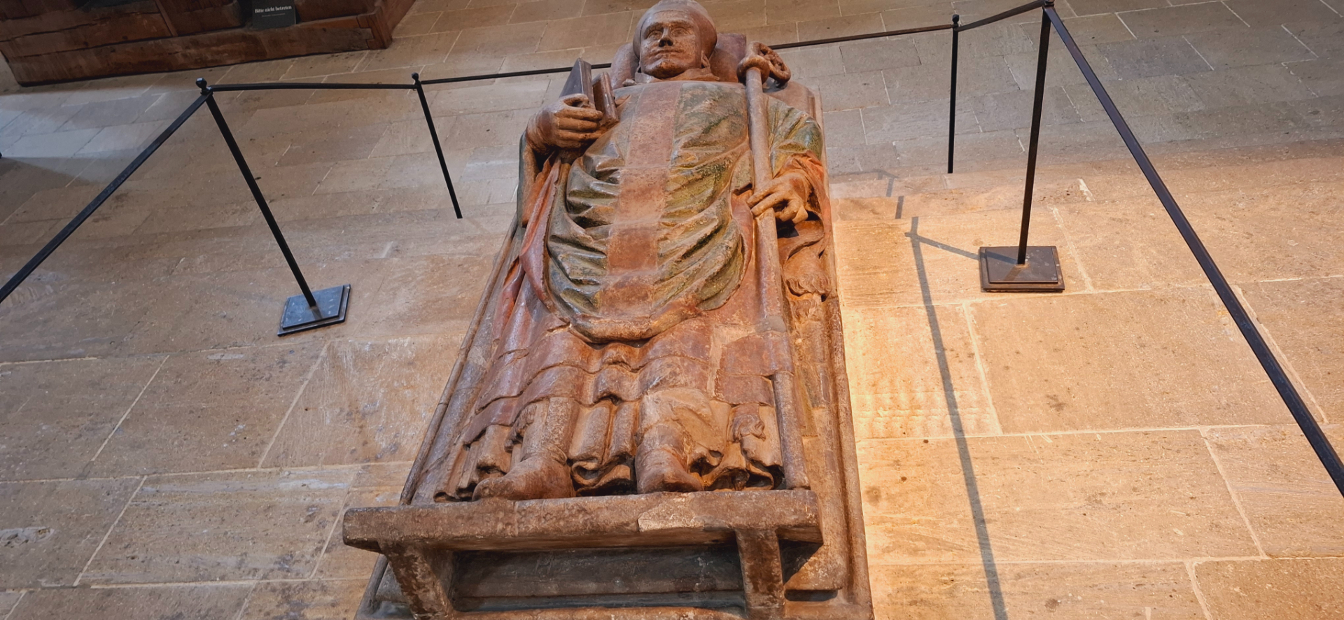 Дитрих II в полном епископском облачении и со всеми регалиями лежит под распятием восточного предела собора.