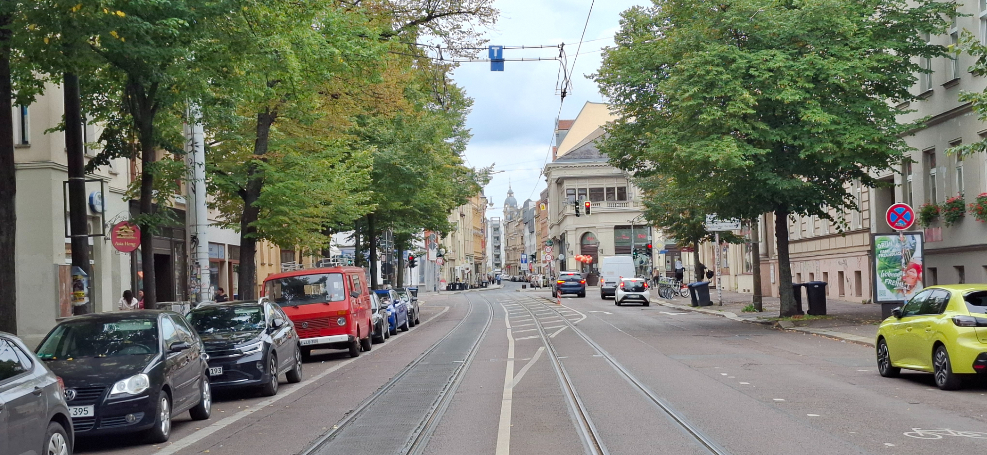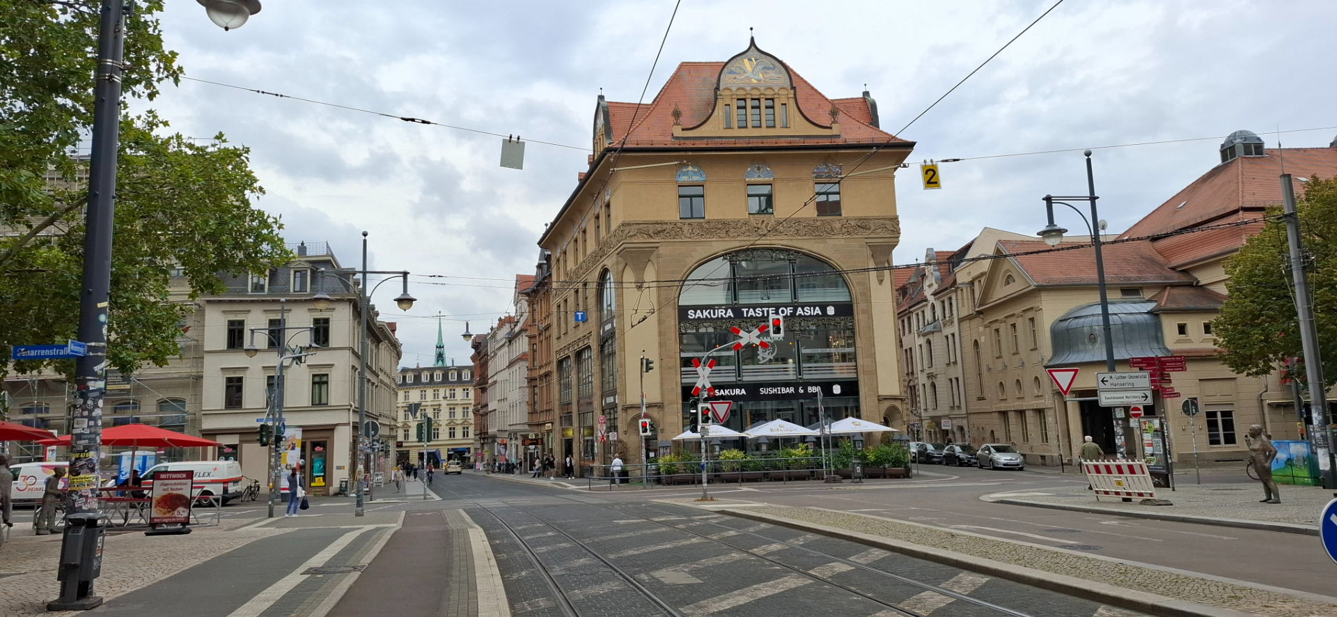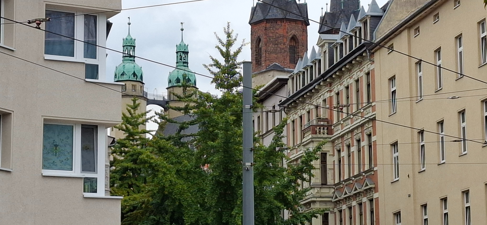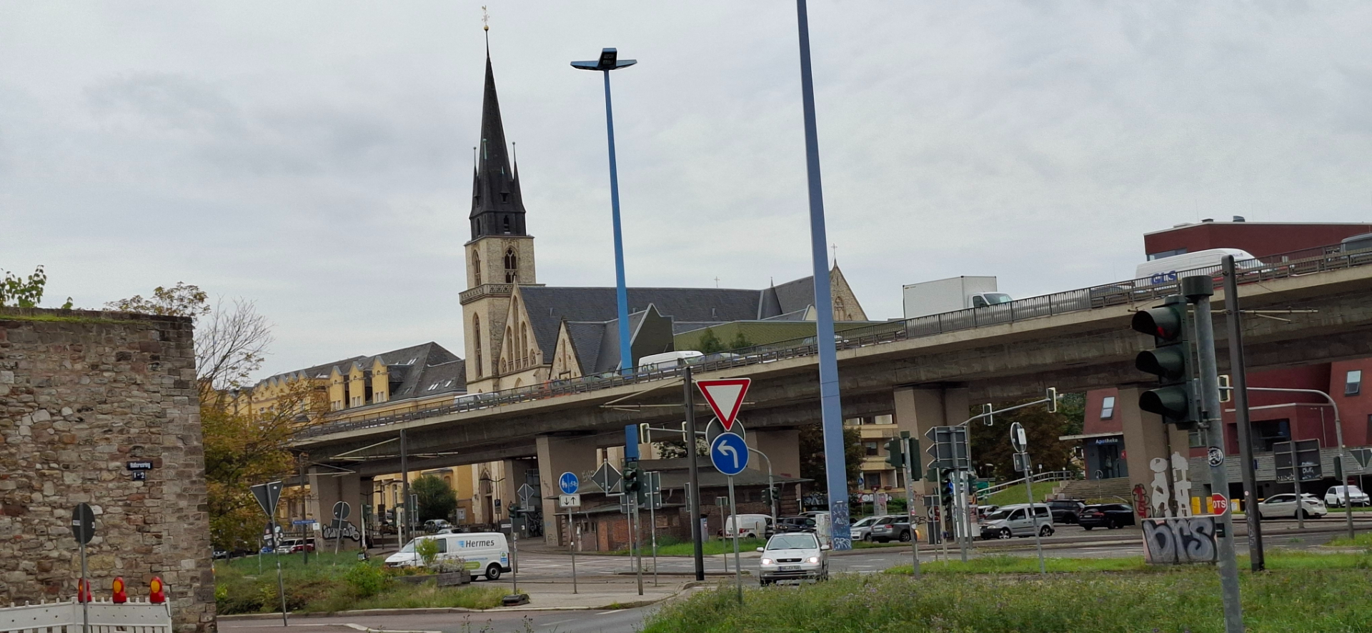 С этого места не видно, что нужный трамвай N7 проходит ниже. Им можно доехать до крепости над рекой Заале, что я и сделала. Написан отдельный отзыв про этот уголок города. По пути крутила головой, запоминая маршрут для обратной дороги, который потом прошла пешком. Мой поход по Халле уложился в 3 часа.