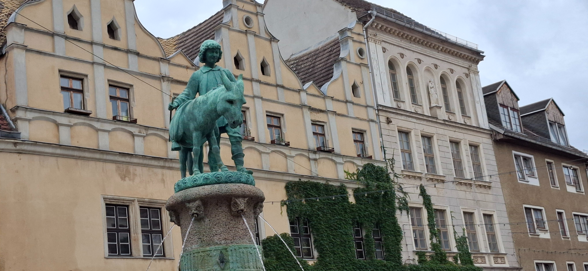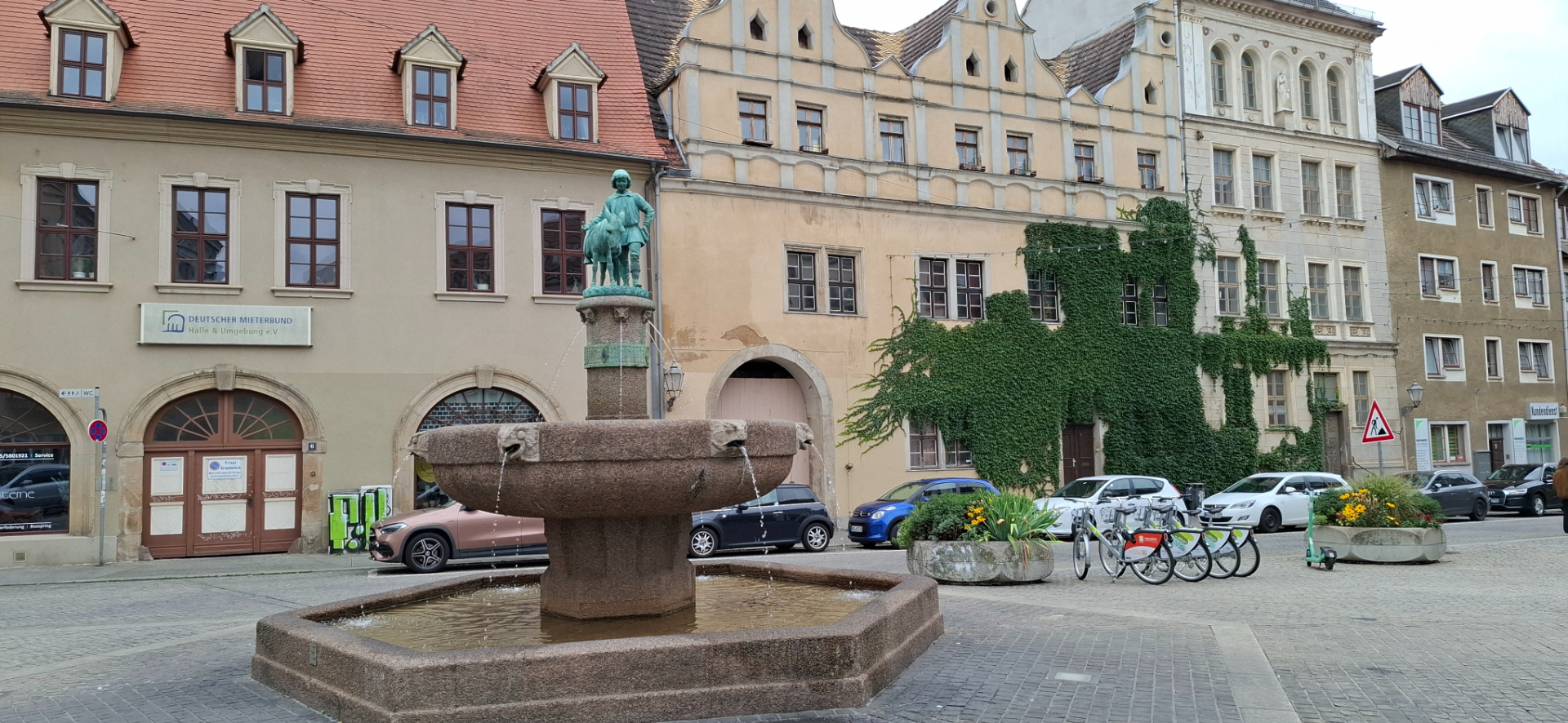 Здешние здания эпохи Возрождения и Ослиный фонтан (Eselsbrunnen), который часто называют «мальчик с ослом», свидетели веков. Есть легенда, в честь чего создан памятник, связана с визитом императора Оттона I в Галле. Горожане, узнав о предстоящем приезде правителя, решили встретить его с почестями. Они усыпали цветами весь путь следования императора. Но из-за половодья на реке Заале Оттон I был вынужден выбрать другой маршрут. Однако, люди стояли и ждали императора у городских ворот Раннишес Тор (Rannisches Tor) - не сохранились до наших дней. И тут вместо правителя увидели простого мальчика, слугу мельника, который вёл нагруженного поклажей осла. Именно этот забавный момент и запечатлён в скульптурной композиции.