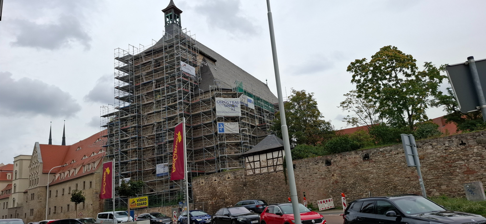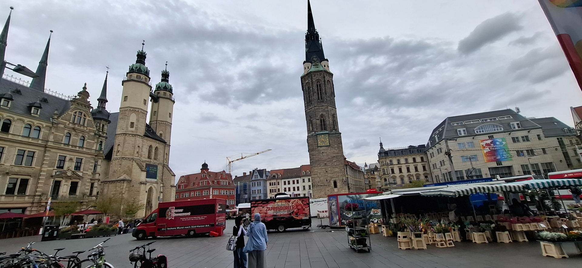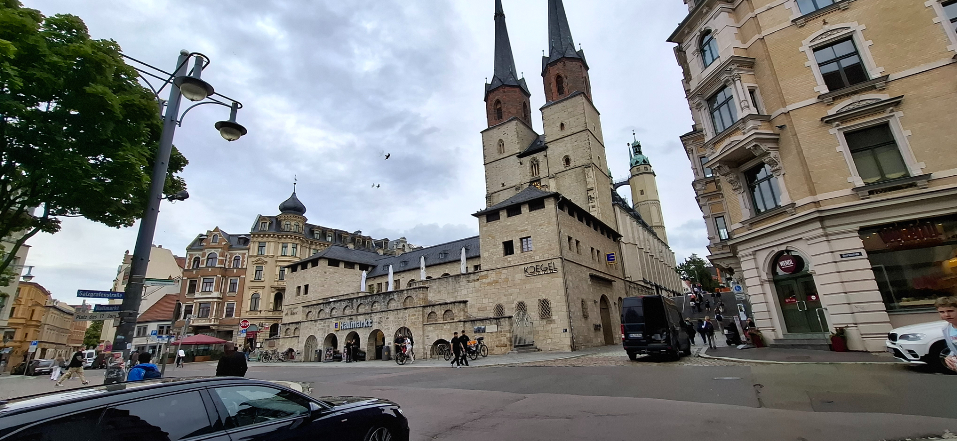 Большая площадь в разные века была сценой для участников волнений. В январе 1919 года, вскоре после Ноябрьской революции, в Халле, как и в ряде других городов Германии (Берлине, Бремене, Дюссельдорфе, Мюльхайме), произошли восстания. Чуть в сторону от этой площади еще очень громадный храм есть. Сбоку - вид на эту высокую церковь, что сейчас в строительных лесах.