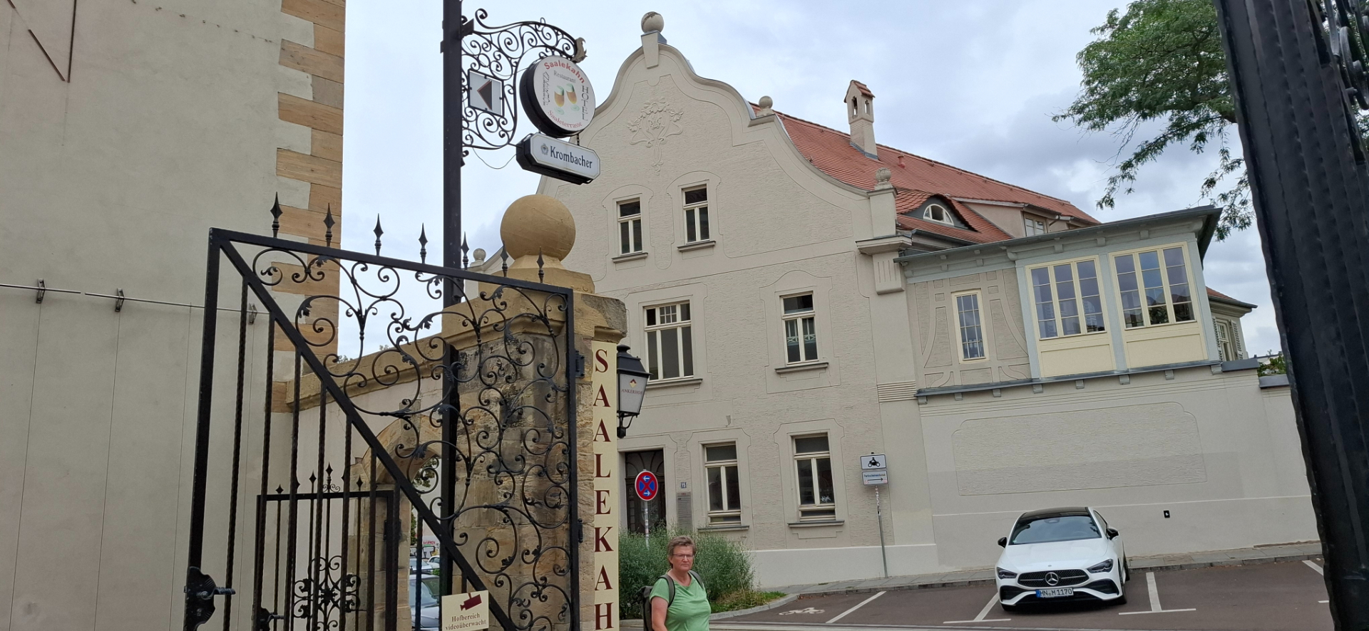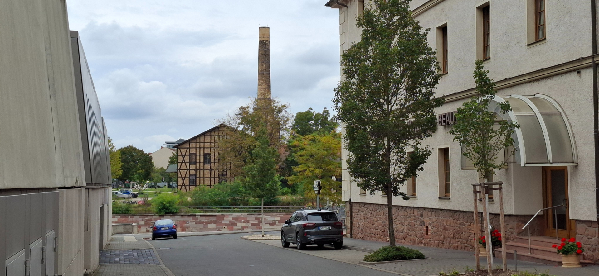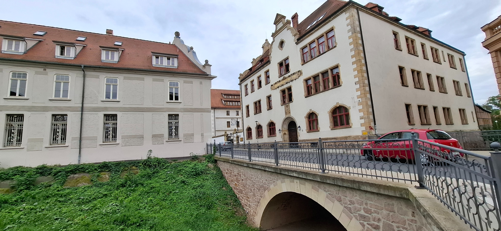 Завернула за эти дома и пошла еще ниже. Мимо высохшего русла притока реки, но с мостиком над ним, идет Ankerstraße - историческая улица с богатой архитектурой. Когда-то тут располагались различные торговые помещения, склады. Теперь их реставрировали под современные предназначения, как отель Ankerhof, или рядом стоящее здание. Отель - бывшее Королевское таможенное управление, переоборудованное в современный вид. Здание имеет богатую историю и расположено на берегу притока реки Заале.
