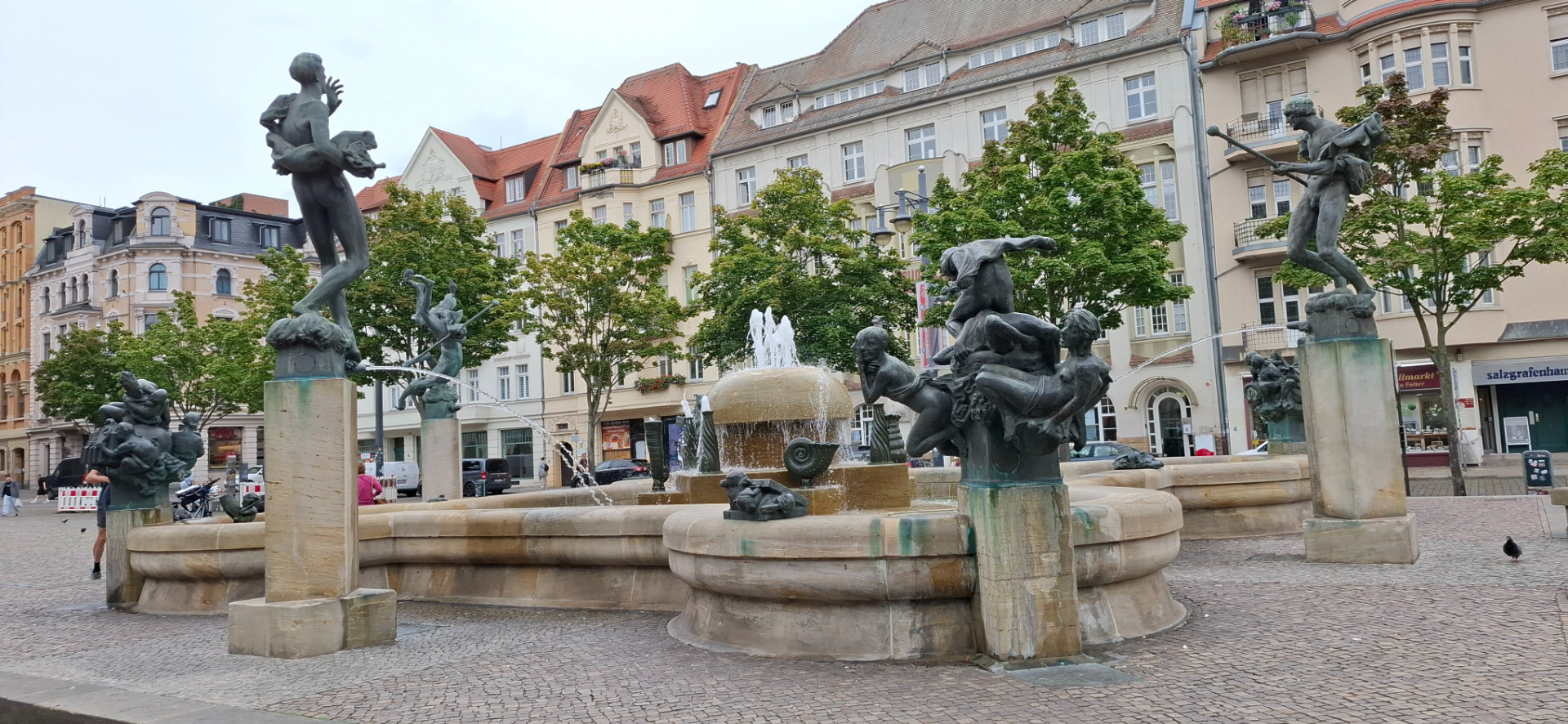 Дошедшие до нашего времени храмы являются символами города и главными его доминантами. В старину Халле называли городом пяти башень, но я нашла их больше. Не пошла на Домплатц из-за ограниченности во времени, и план по кирхам считала уже выполненным. В многочисленных поездках прошло желание все, все оббегать и посмотреть, что увижу по пути от жд и назад – и хватит. Кроме объектов, ради которых, бывает, и приезжаю. Поднялась вверх к Рыночной площади. Чтобы попасть на Рыночную площадь, надо взойти по высокой лестнице сбору от Мариенкирхе. За храмом стоит фонтан с драконами. Драконы часто использовались, как символы защиты, силы или мистических традиций. В контексте расположения возле церкви они могут символизировать победу над злом или отражать средневековые представления о защите святости храма.