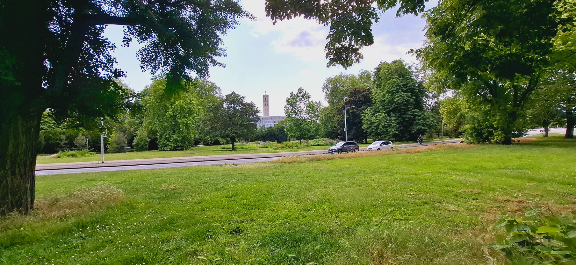 По правую сторону после мостика начался парк. На открытом пространстве вдалеке видна башня.