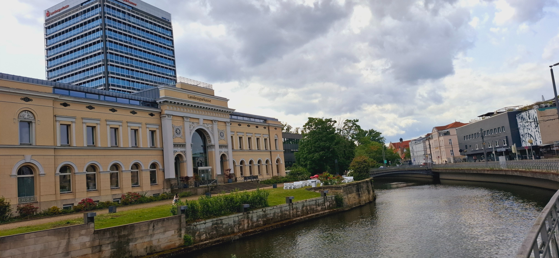 Кварталы с грюнденскими домами и река рядом с дорогой.