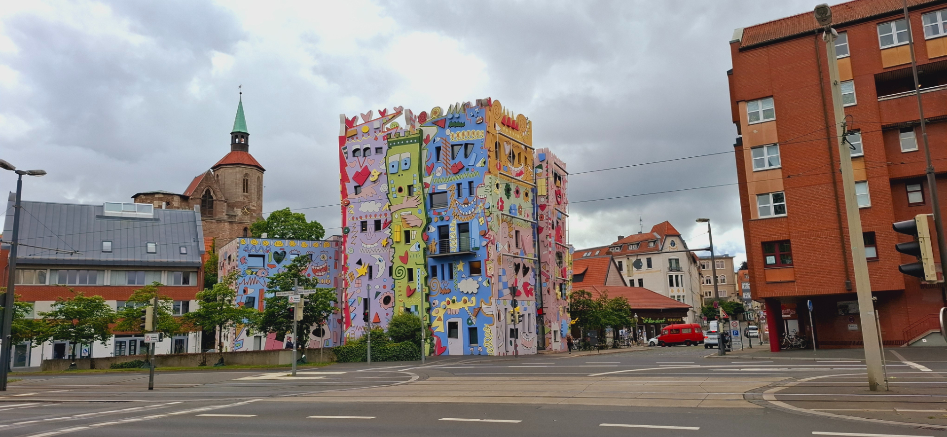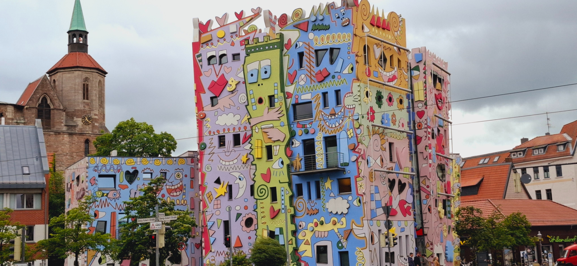 Отсюда спуск на оживленную улицу. Опять оказалась около ТЦ Schloss-Arkaden. В этот раз моей целью были кварталы за ним. Первым вижу разноцветный «Счастливый дом Рицци».