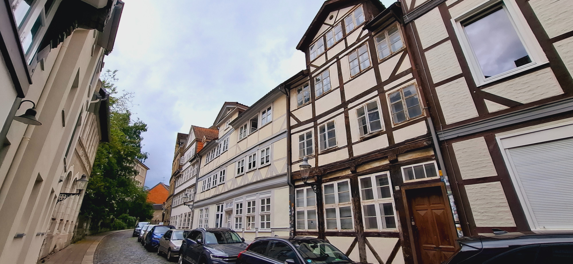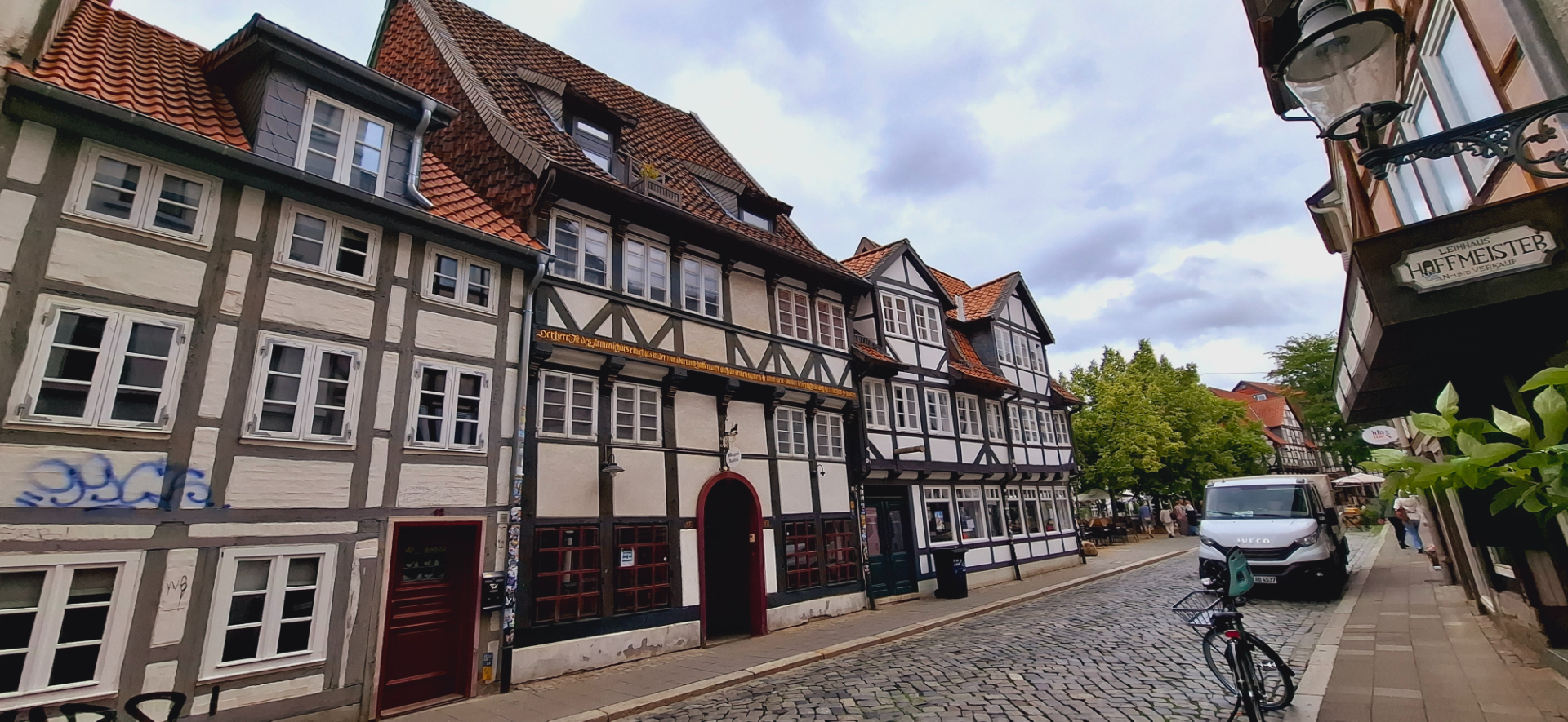 Пройти влево от площади, если стоять лицом к Старой Ратуше, будут небольшие улицы с жилыми домами местных жителей. Опять повернула и вышла на широкую штрассе с интересным фахверковым уголком.