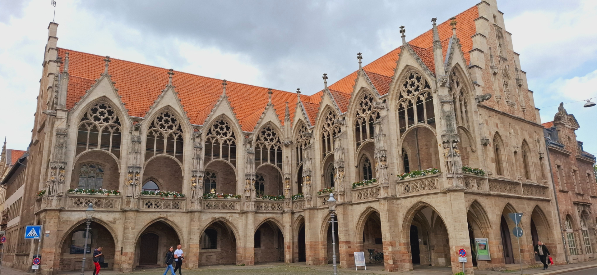 Слева тянется вдоль всей ширины (или длины?) площади серое массивное здание - Дом гильдии портных. С торца у него вот такой нарядный фасад. Так же он служил и винным складом, арсеналом и под другие надобности его приспосабливали с 1303 года. Сколько раз профиль меняли, столь же раз и перестраивали.
