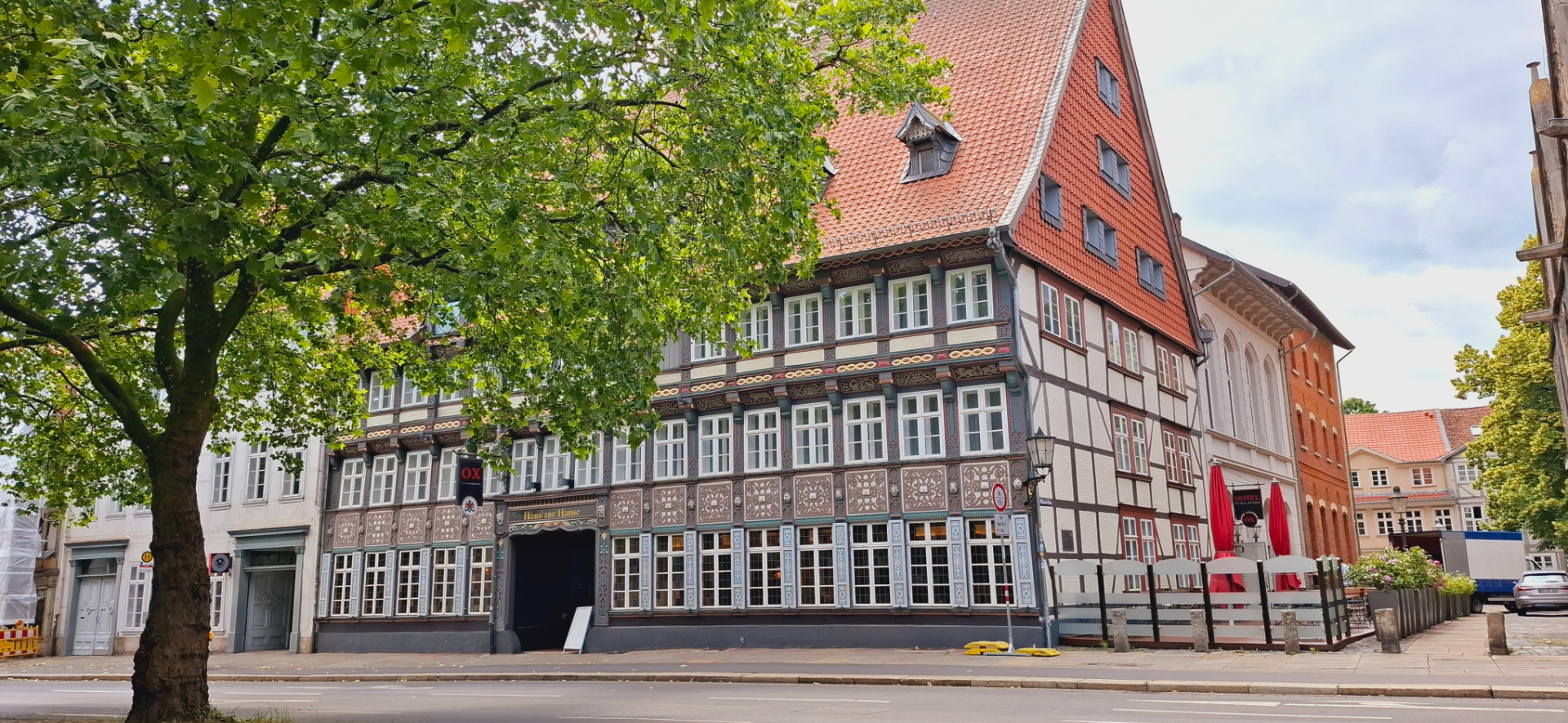 Стоят плечом к плечу «Дом Розы" и "Дом со Звездой". У первого первоначальный фасад 1590-ого года с реконструкцией в 19 веке, у второго - 1894 года. Звезда наверху приделана и на перестроенный дом, как и на его фахверковом предшественнике 1356 года. Потому дом и получил это название после его возведения, когда старый снесли, построили новый, то название оставили, и звезду, соответственно. "Дом Солнца" конца 18 века с перестройкой 1885 года, с магазином на 1 этаже, выделяется колером и украшениями на фасаде.