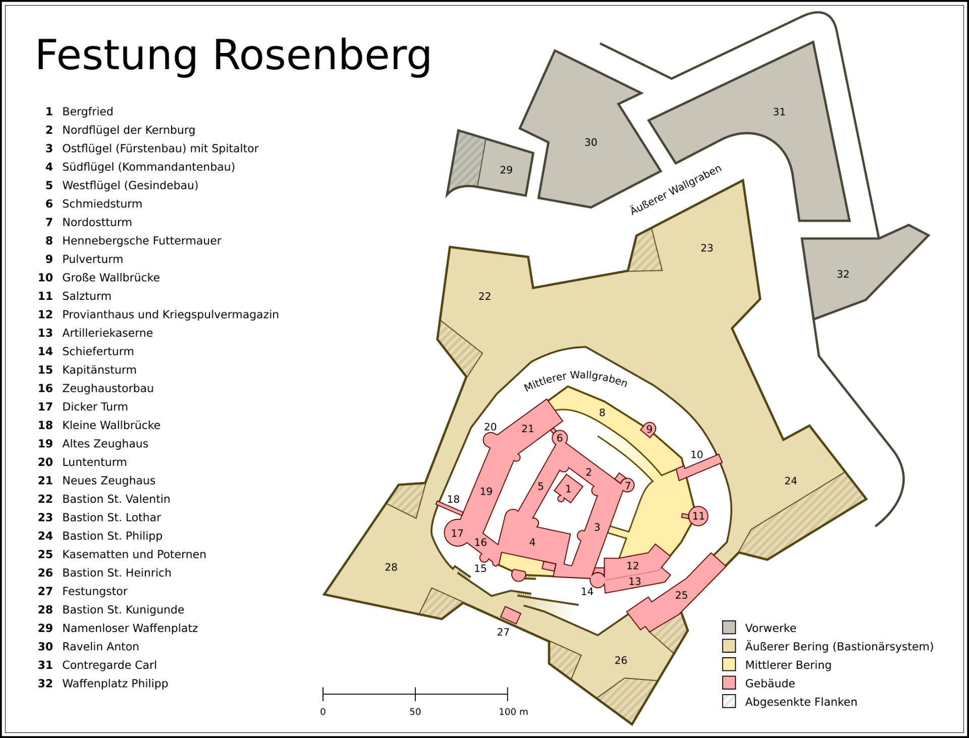 Стены сохранили свой первоначальный вид, сделаны из камня, обтесанного вручную мастерами 13 века. Крепость выдержала все штурмы вражеских армий, но была взята восставшими крестьянами во время Крестьянской войны 1525 года. Потому в начале XVII века, основываясь на опыте многочисленных войн XV-XVI веков, было решено еще больше укрепить Розенберг, и вокруг крепости возвели третье внешнее кольцо укреплений.