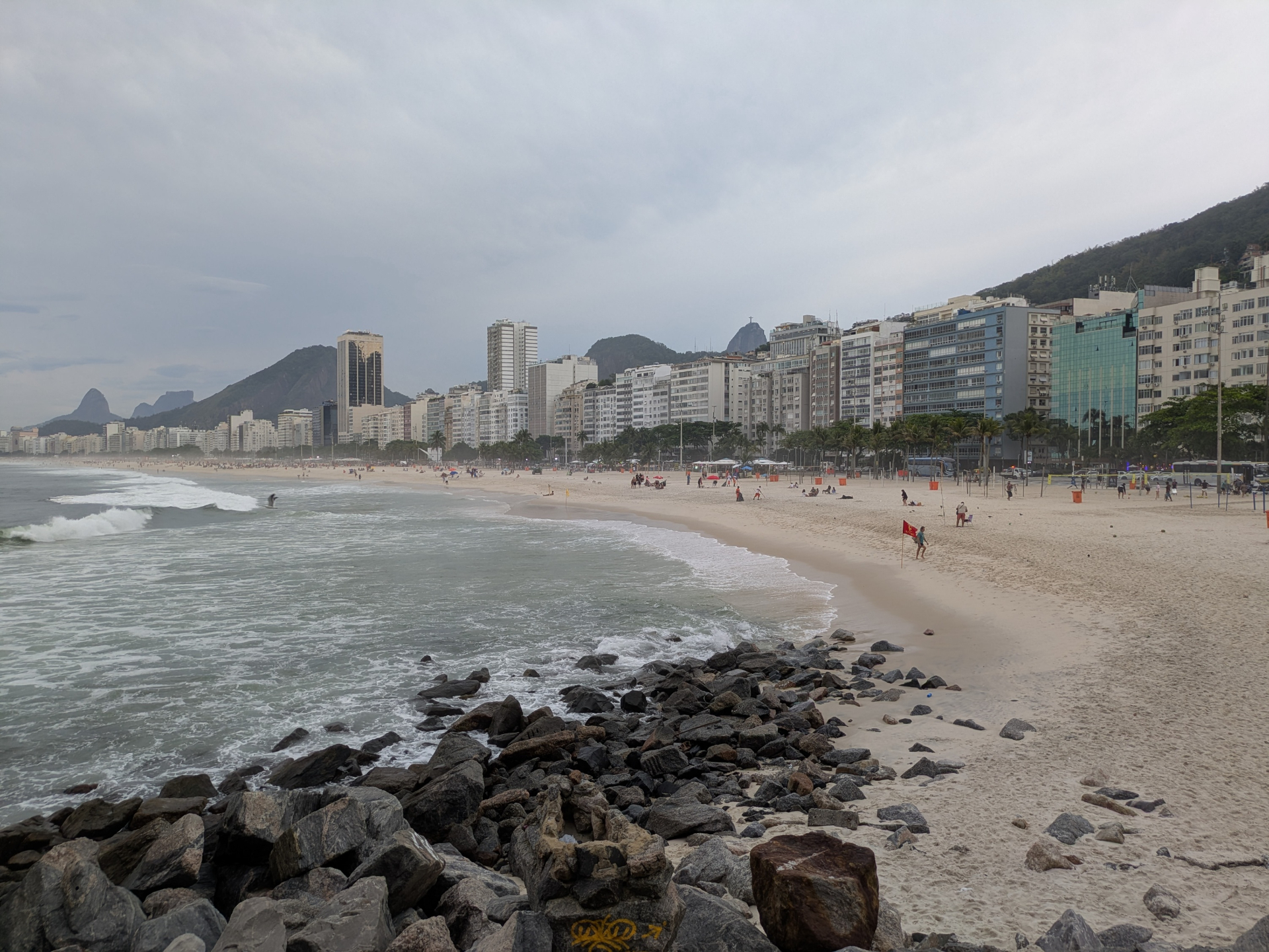 Придя на Копакабану, мы расстелили пляжную подстилку; я разделся (кстати, кабинок здесь нет; если не сразу пришли в купальном одеянии, то придётся заворачиваться в полотенце), намазался от солнца (возможно, зря, т.к. солнце показывалось всё реже, а потом и вовсе исчезло за тучами) и пошёл пробовать воду.