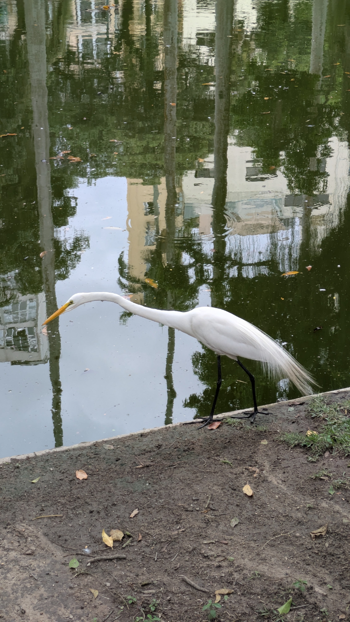 Пройдя парк, мы случайно вышли на какую-то аллею, в центре которой был маленький симпатичный прудик. У пруда стояла красивая белая хохлатая цапля и что-то пристально высматривала в воде.