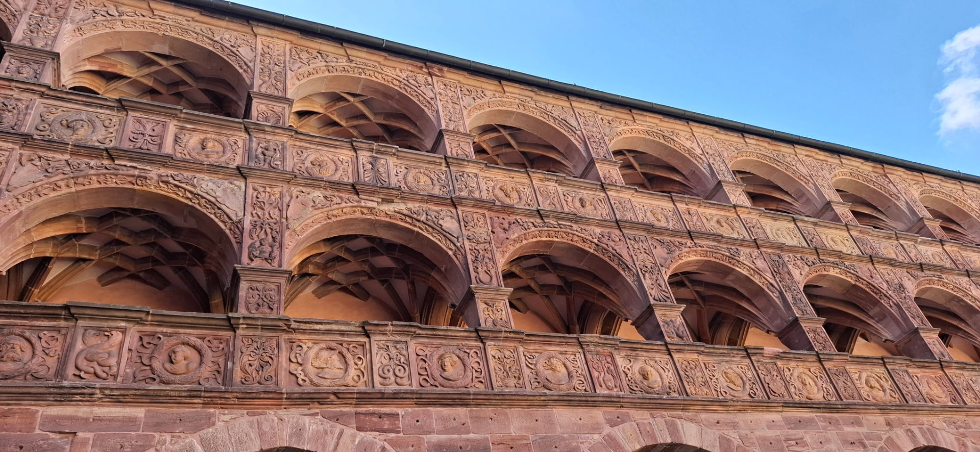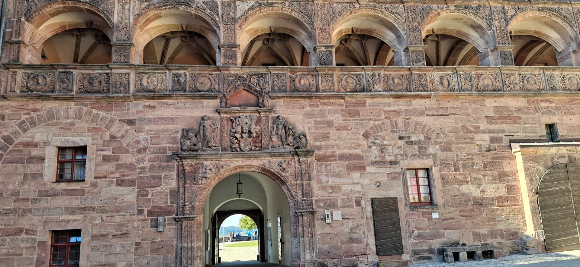 На дворовых сторонах были устроены открытые галереи со сплошными аркадами, напоминающие архитектуру итальянских палаццо. По галереям идут более чем 120 рельефов, изображающих родословную Гогенцоллернов. Для них Плассенбург была главной резиденцией, замком-администрацией и казной. Каменные лица со сбитыми носами, пустые глазницы и прочее, как нельзя лучшая эпитафия этому семейству. Работы над ними проводились между 1565 и 1570 годами.