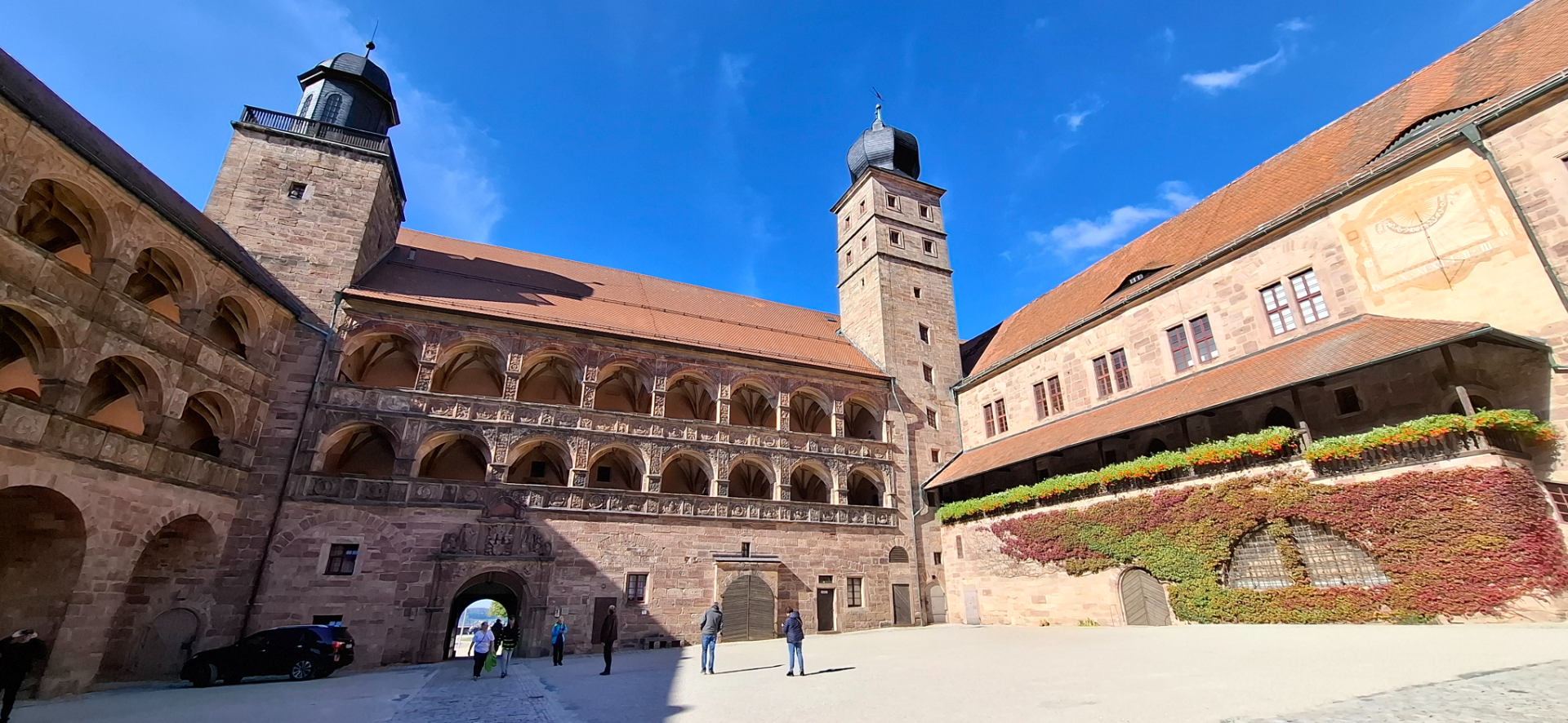 С 1559 года началось строительство четырёхугольного здания в стиле Ренессанс, которое стало основой «Прекрасного двора» (Schöner Hof). Более пышные формы дворового фасада по сравнению с наружным соответствуют старой традиции в замковой архитектуре. Высокий арочный проезд украшен фигурами, растительным орнаментом, медальонами. Въездной портал символизировал высокий статус владельцев, торжественность вступления в представительский двор с роскошными галереями.