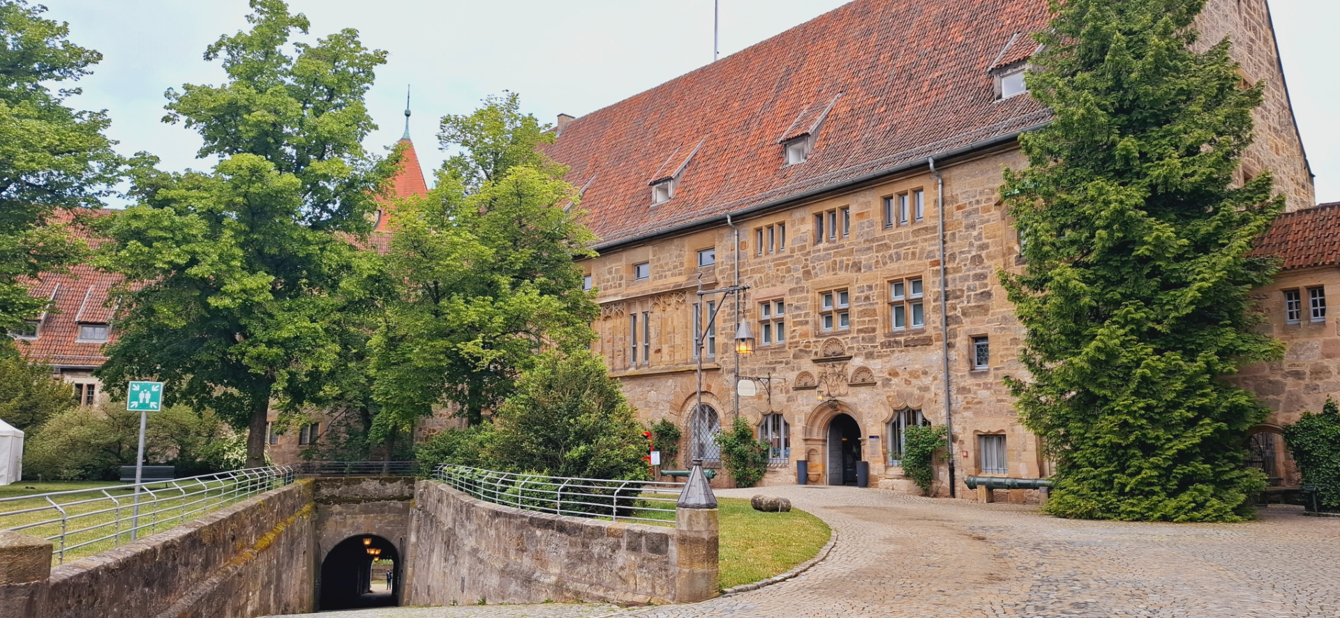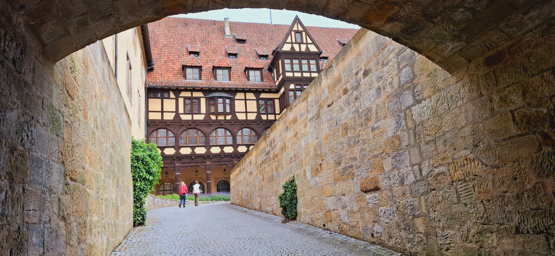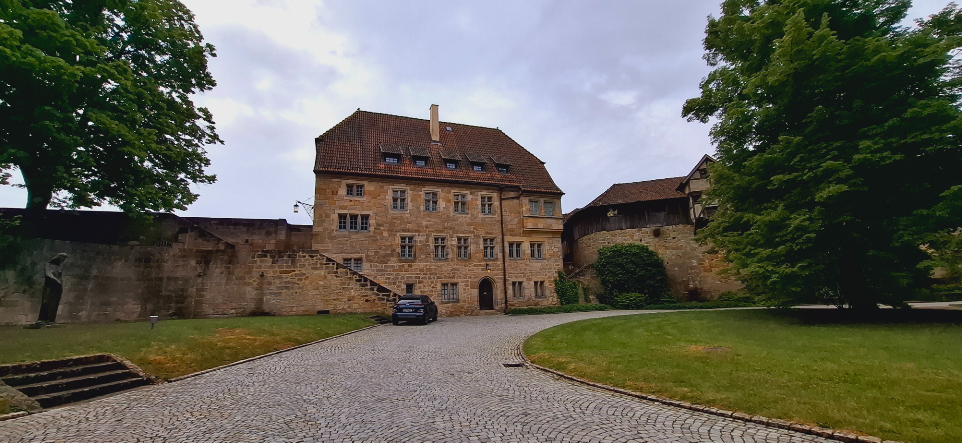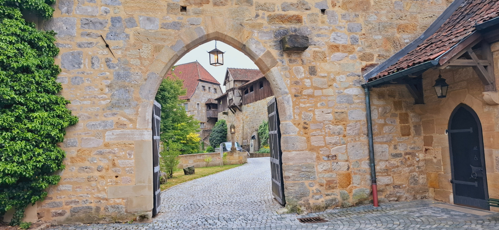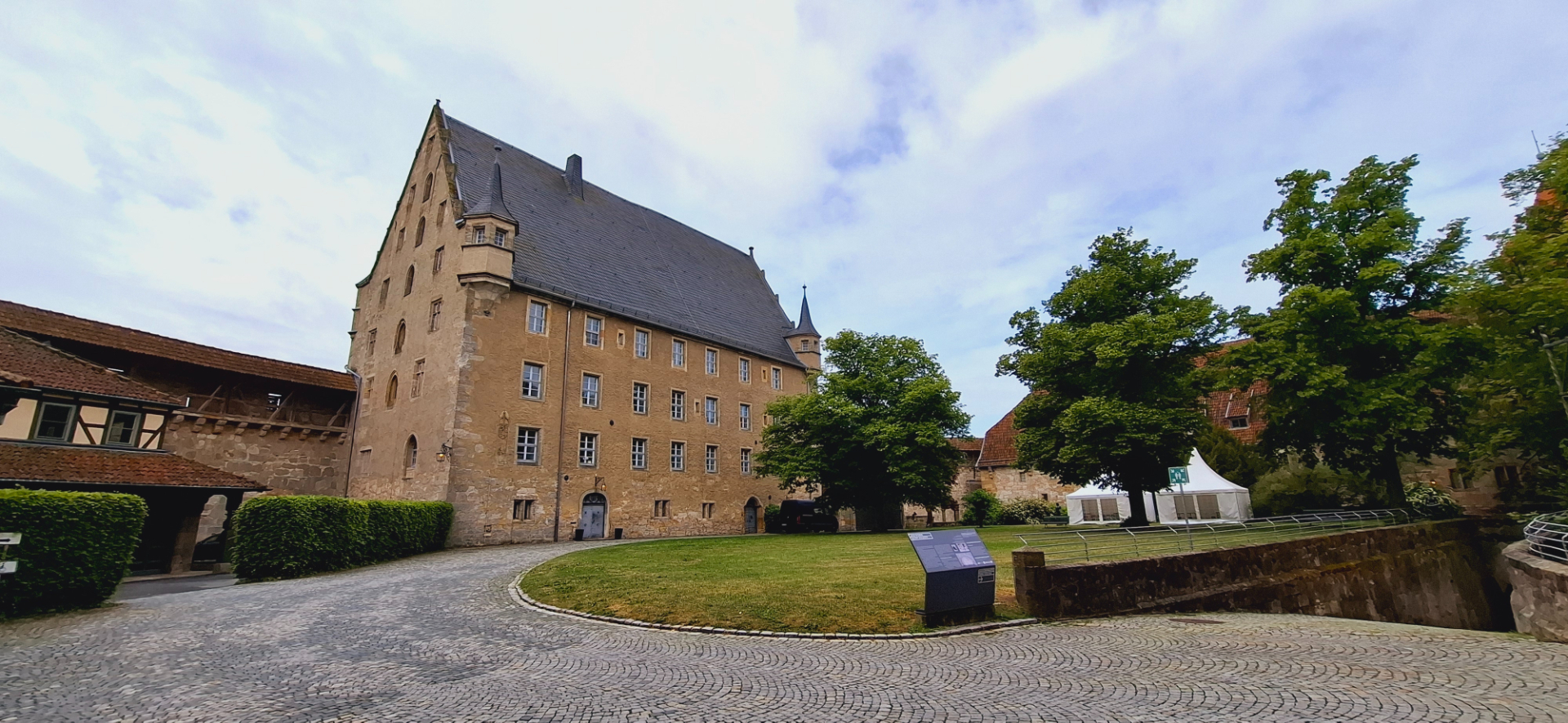 Первым предстает двор с вахверковым зданием, в эльзаском» стиле, изнутри похож на усадьбу с пристроенной к нему часовней и обязательный для крепости колодец.