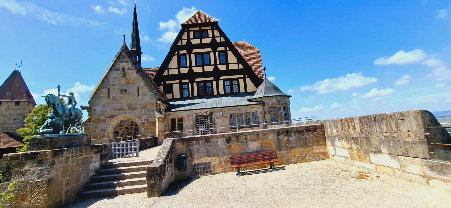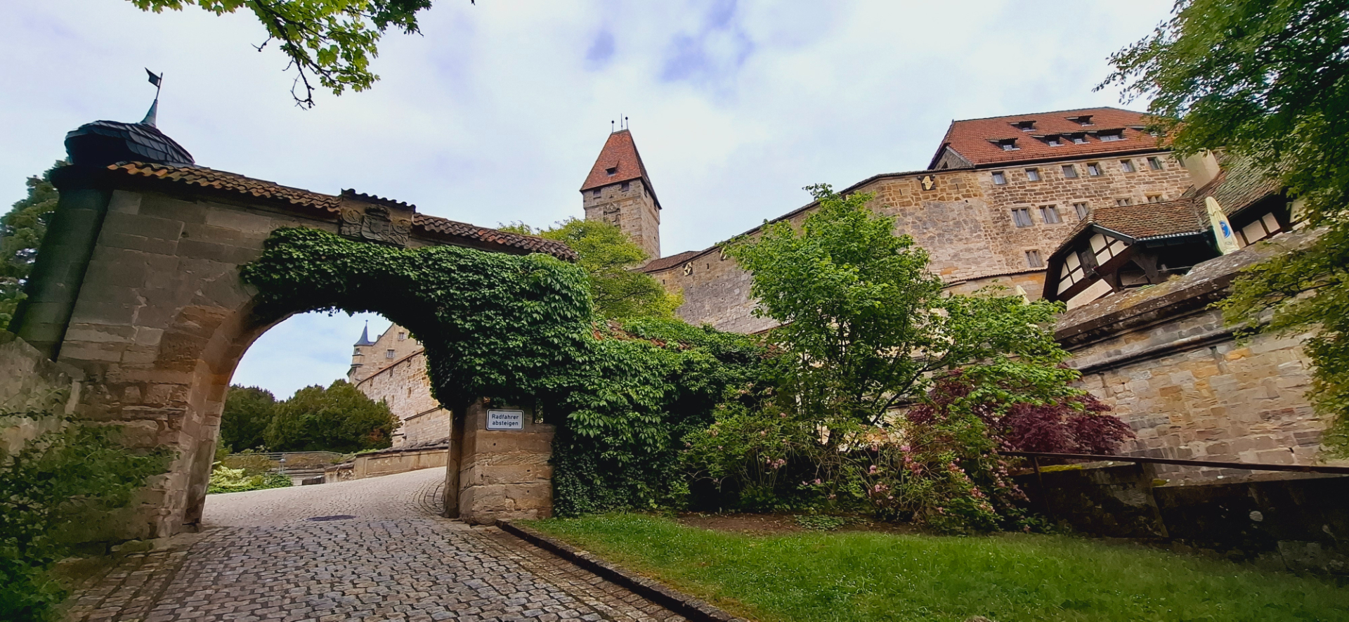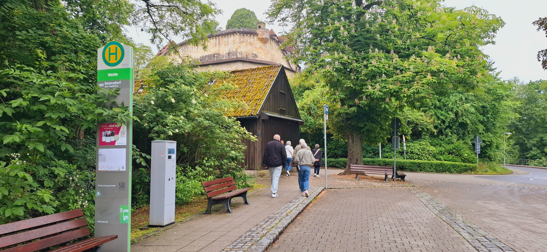 Фесте Кобург, наряду с крепостью Траусниц, одна из самые старинные, сохранившихся в отличном состоянии крепость Германии. Не раз переходила из рук в руки, за крепость боролись представители могущественных правящих династий. С конца 15 века, когда династия Веттинов разделилась на несколько ветвей, крепость стала резиденций герцогов Кобургских, и оставалась ею вплоть до Баварской революции1918 года. Громада крепости вздымается над остановкой и прилегающей автостоянкой.