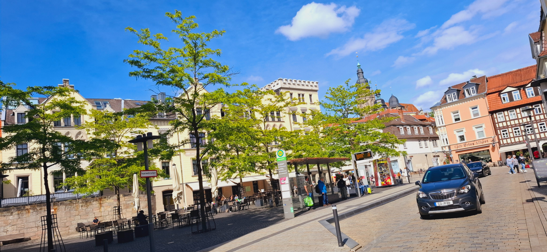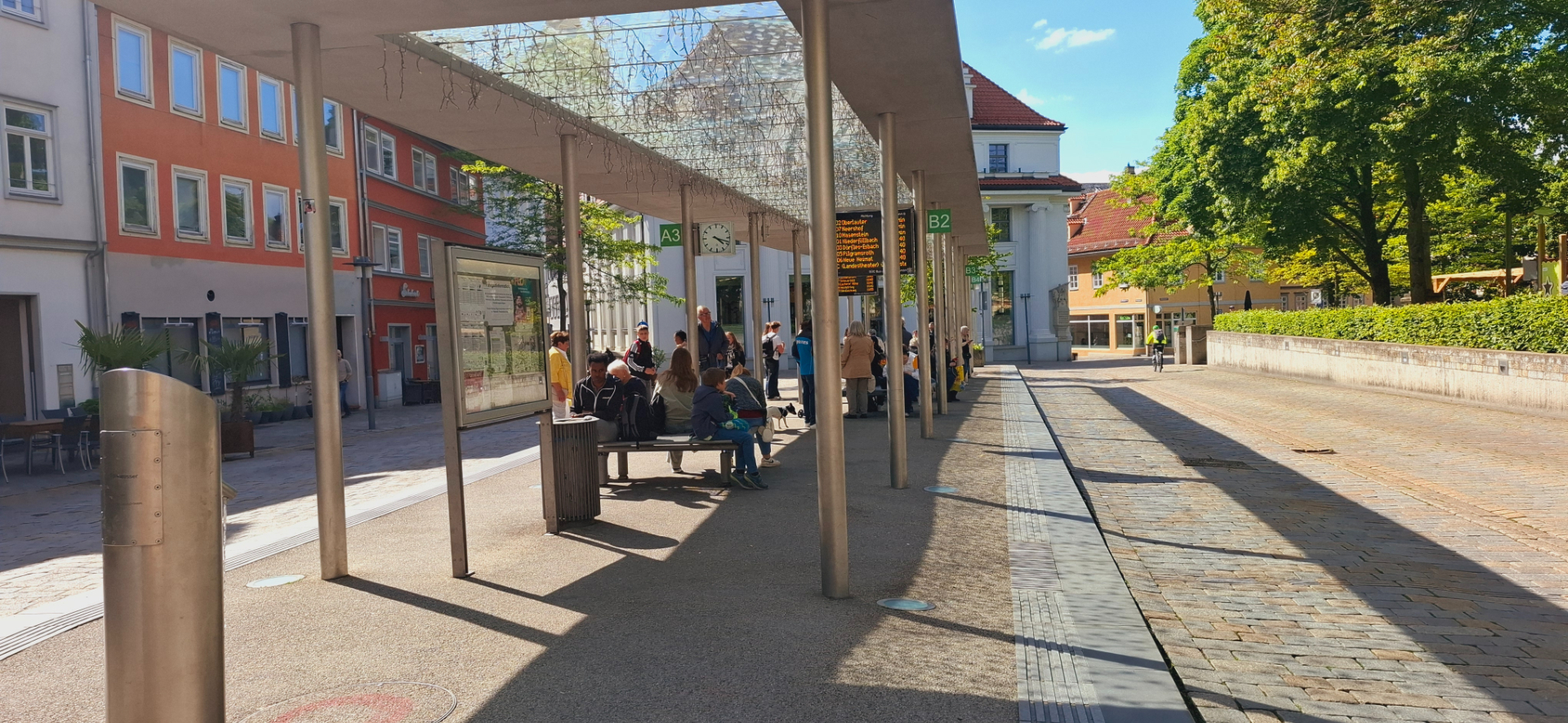 Не соблазняйтесь на жд вокзале, увидев этот же номер, оттуда он идет в противоположную сторону города. У автобуса, скорее всего, кольцевые маршруты в разные стороны. Перестала удивляться, что под одним и тем же номером в Германии разные маршруты есть. Итак, от Театрплац автобус сразу начинает взбираться в гору. По времени минут 10 езды и вот мы на месте. Расписание назад на столбе. Интересно, что назад едет в два раза дольше, потому что объезжает пригорода вокруг горы. Но на ту же остановку Театрплац прибывает в конце-концов. Тут пересесть на автобус, что довезет уже прямо до крепости.